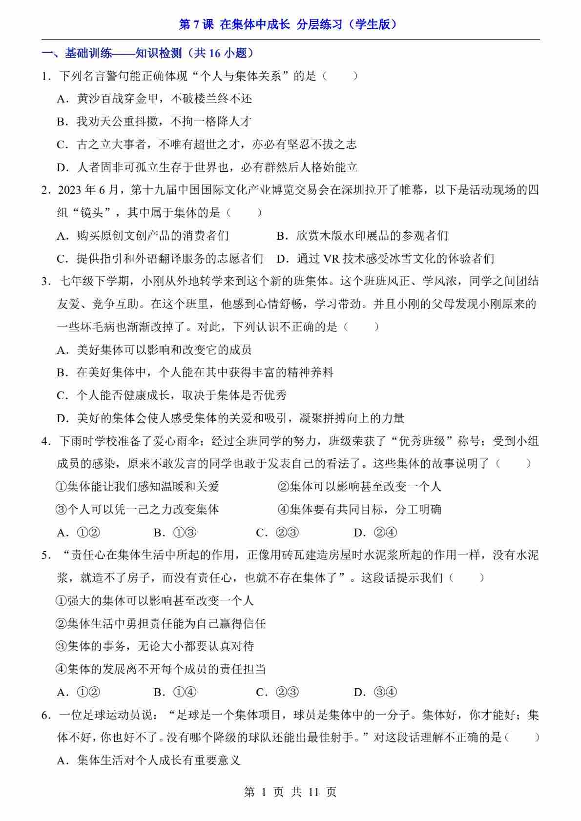 第7课 在集体中成长(分层练习)