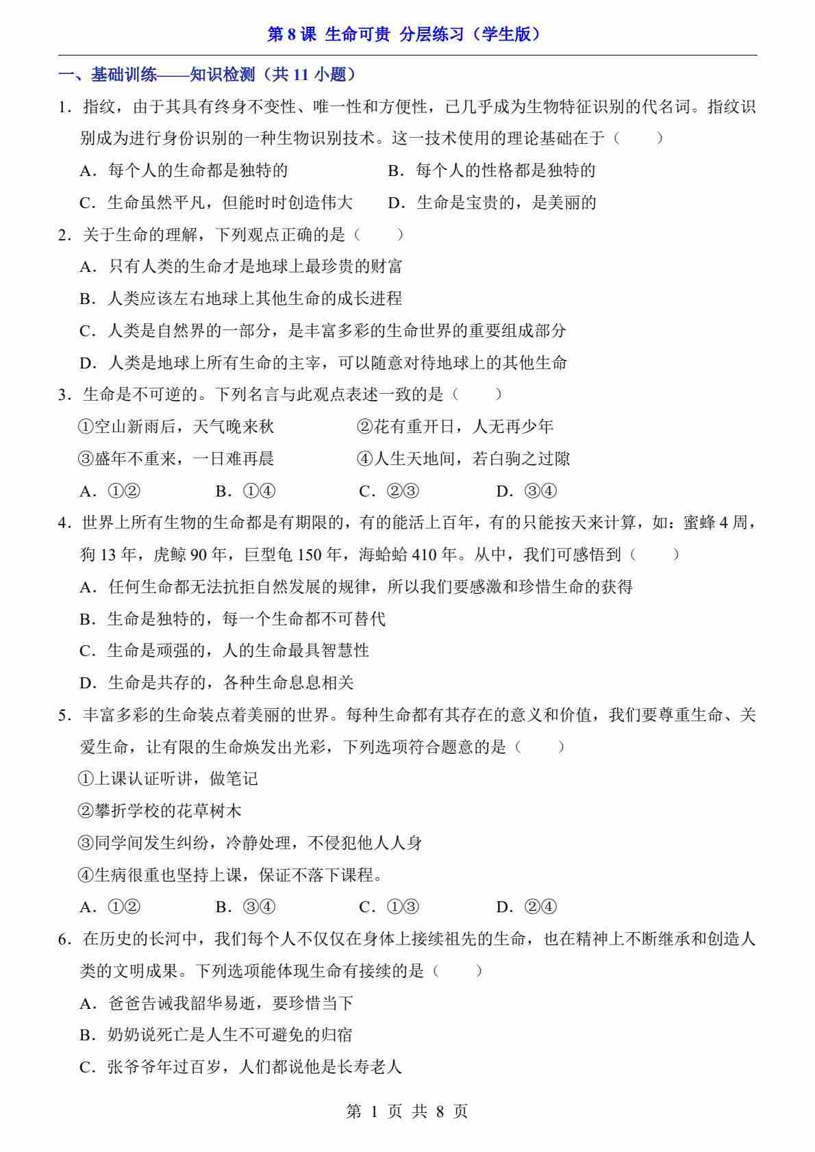 第8课 生命可贵(分层练习)