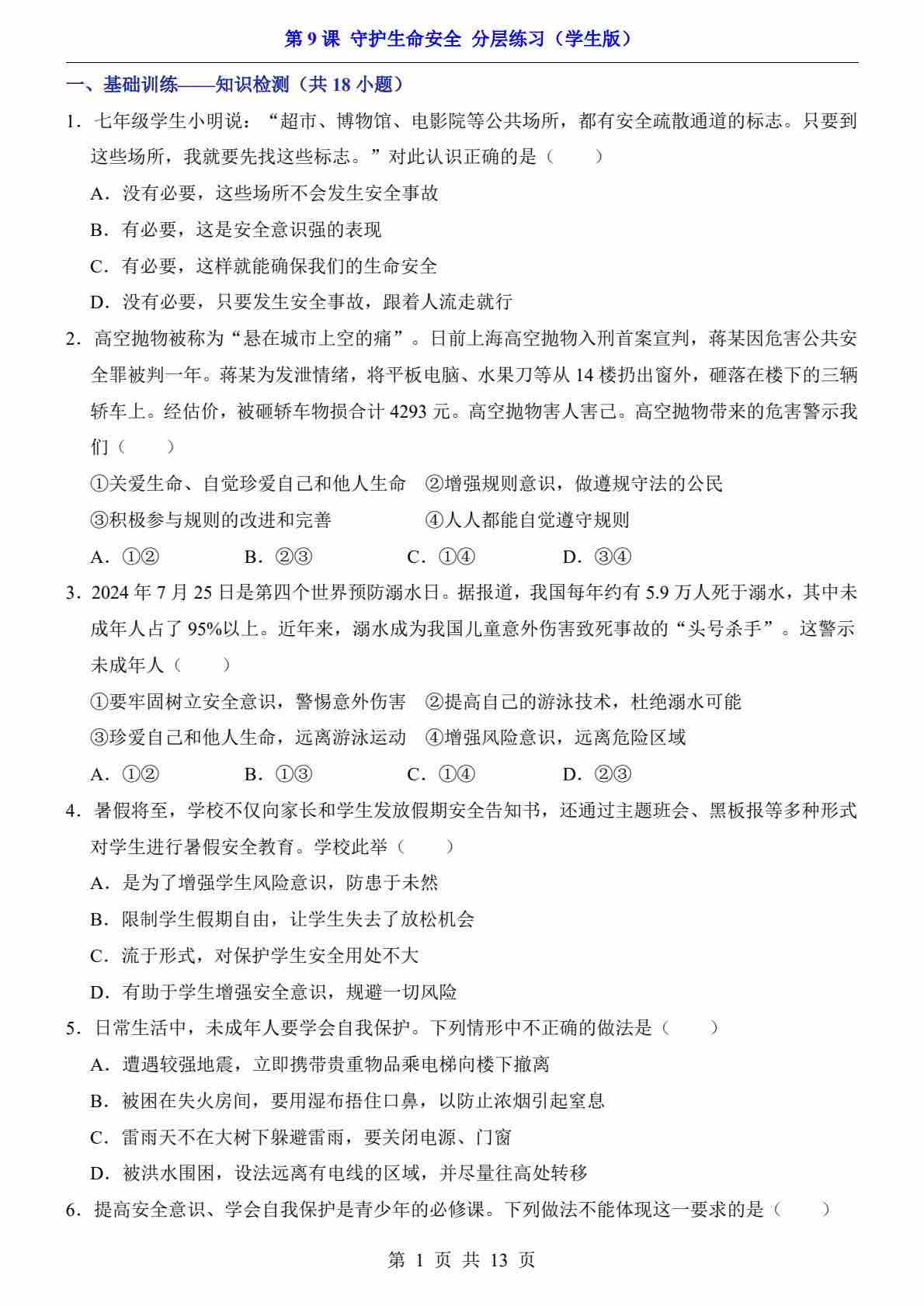 第9课 守护生命安全(分层练习)