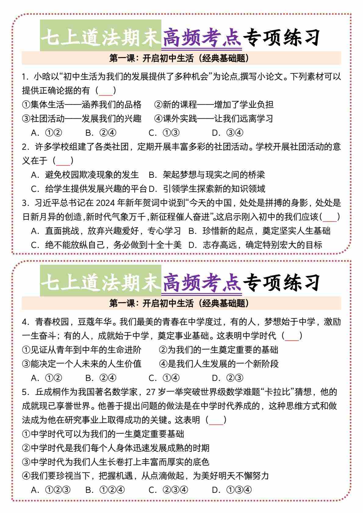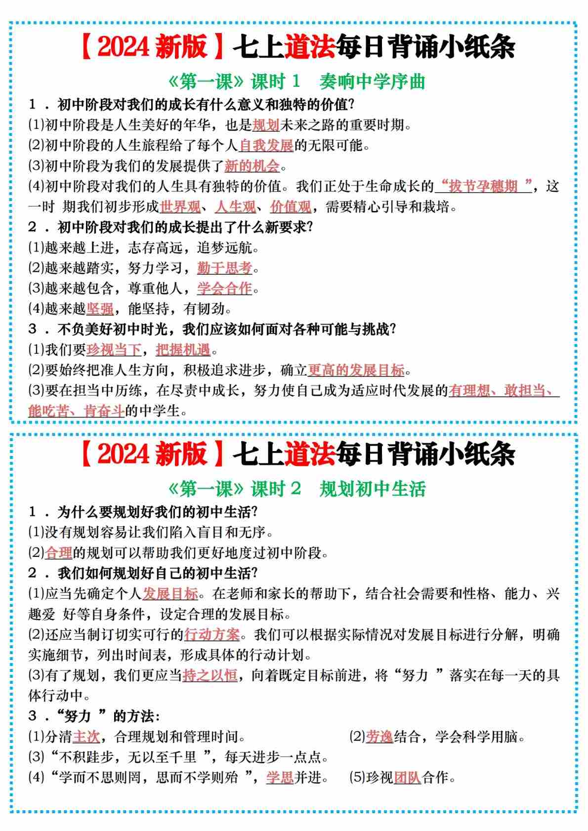 1七上道法期末开启初中生活高频考点小纸条