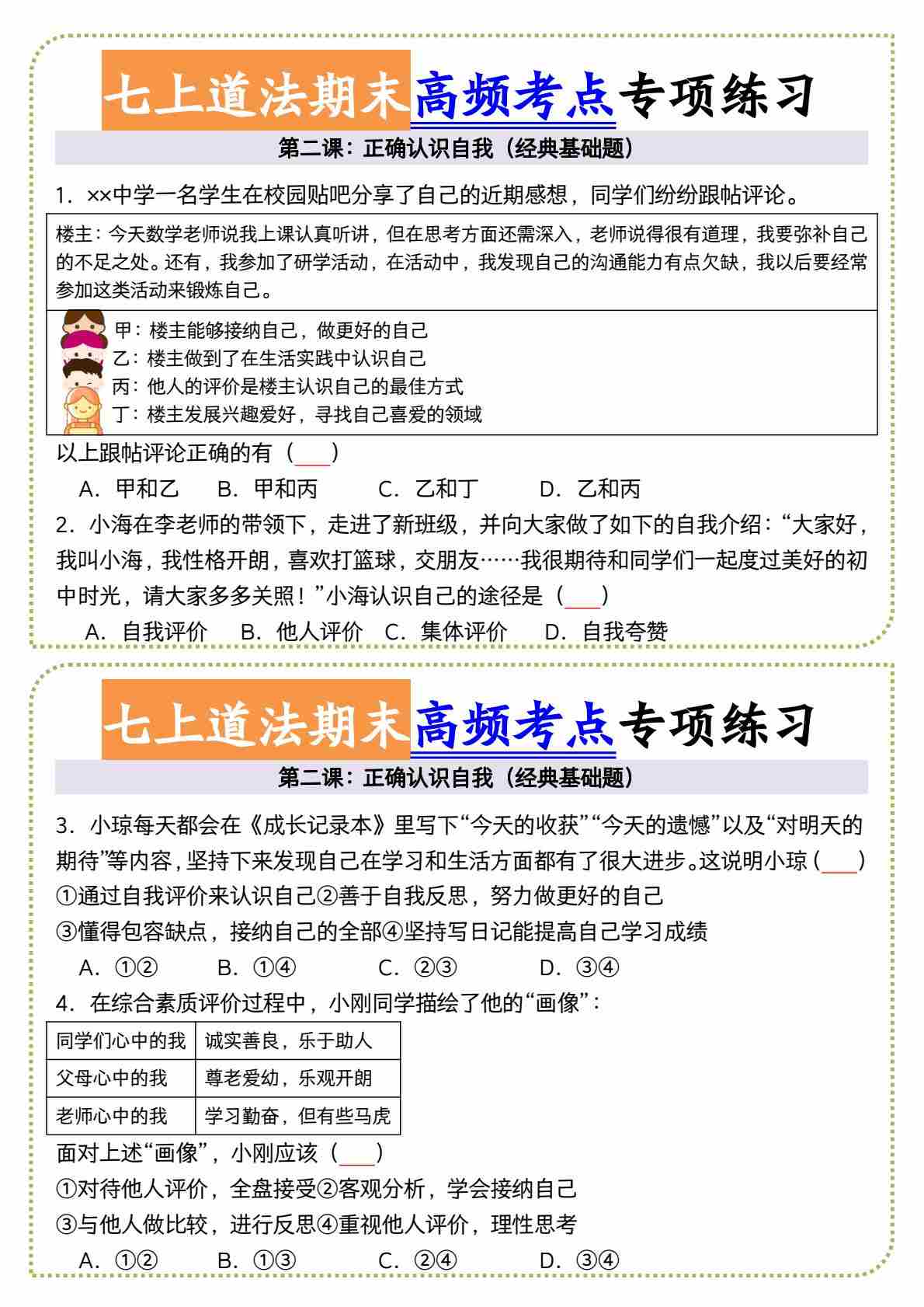 2七上道法期末正确认识自我高频考点小纸条