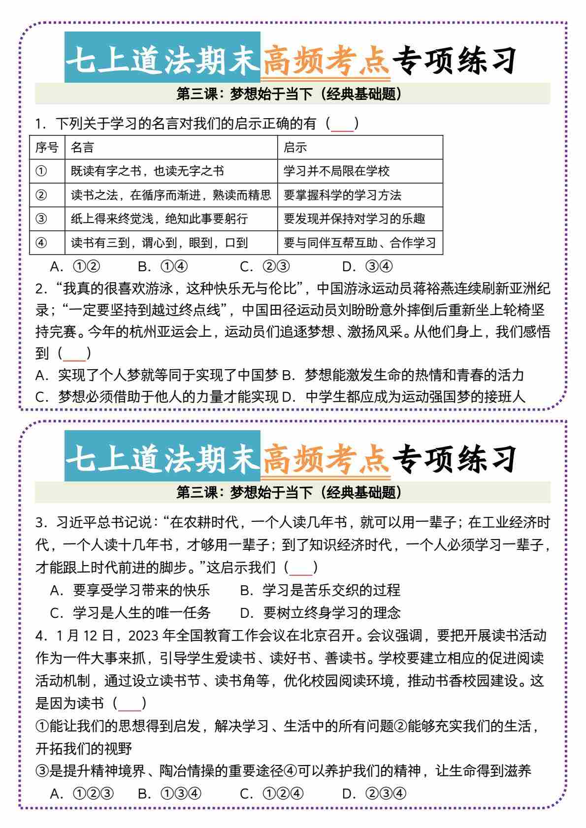3七上道法期末梦想始于当下高频考点小纸条