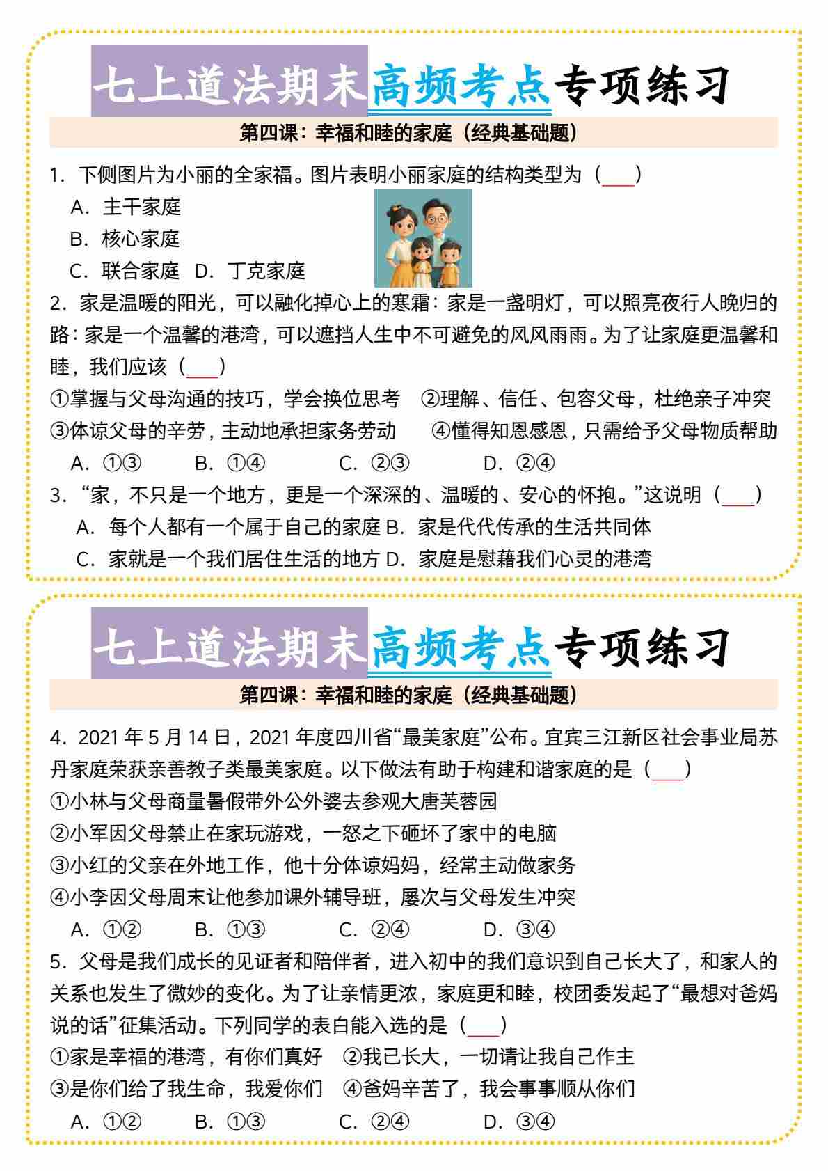 4七上道法期末幸福和睦的家庭高频考点小纸条