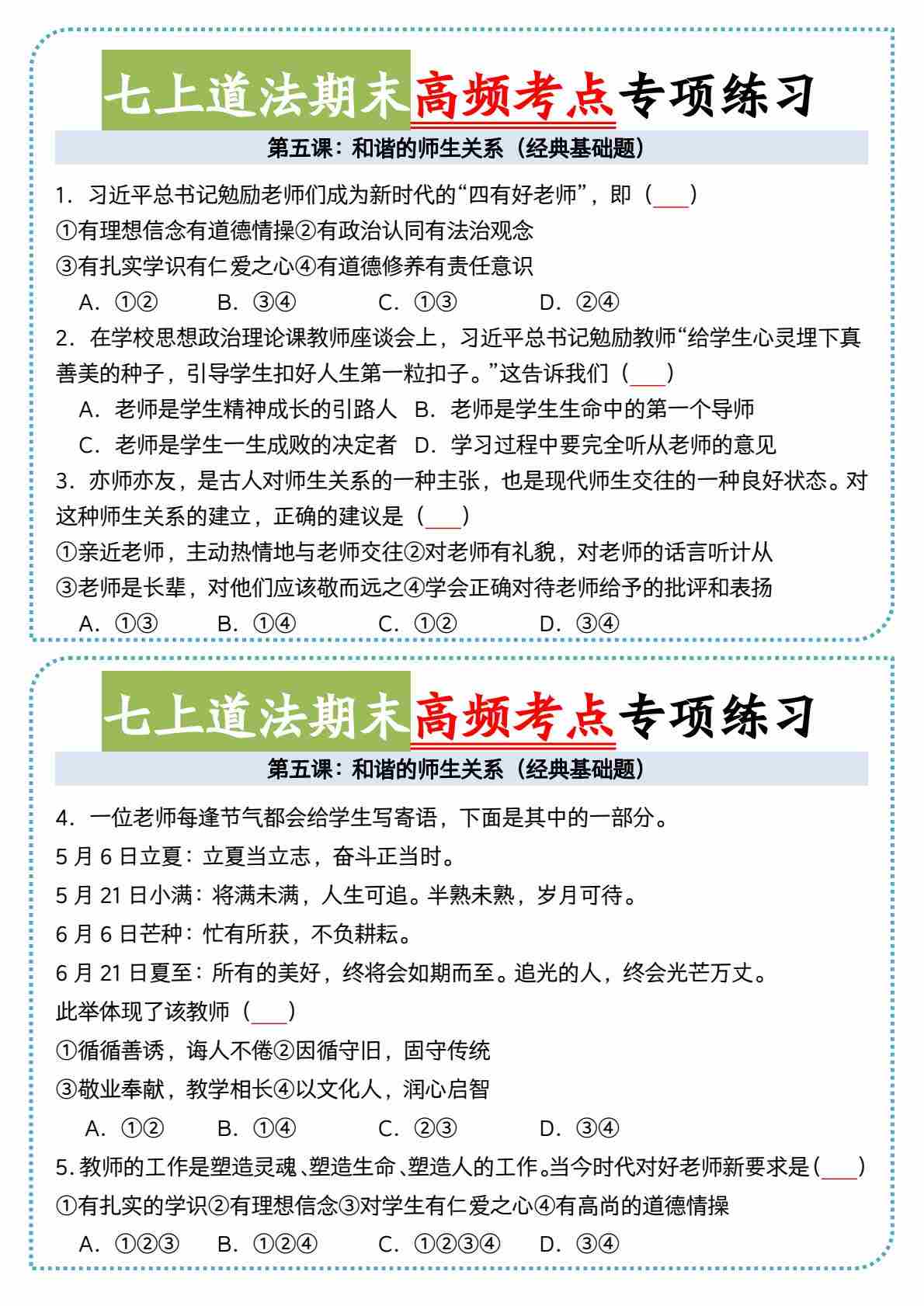 5七上道法期末和谐的师生关系高频考点小纸条