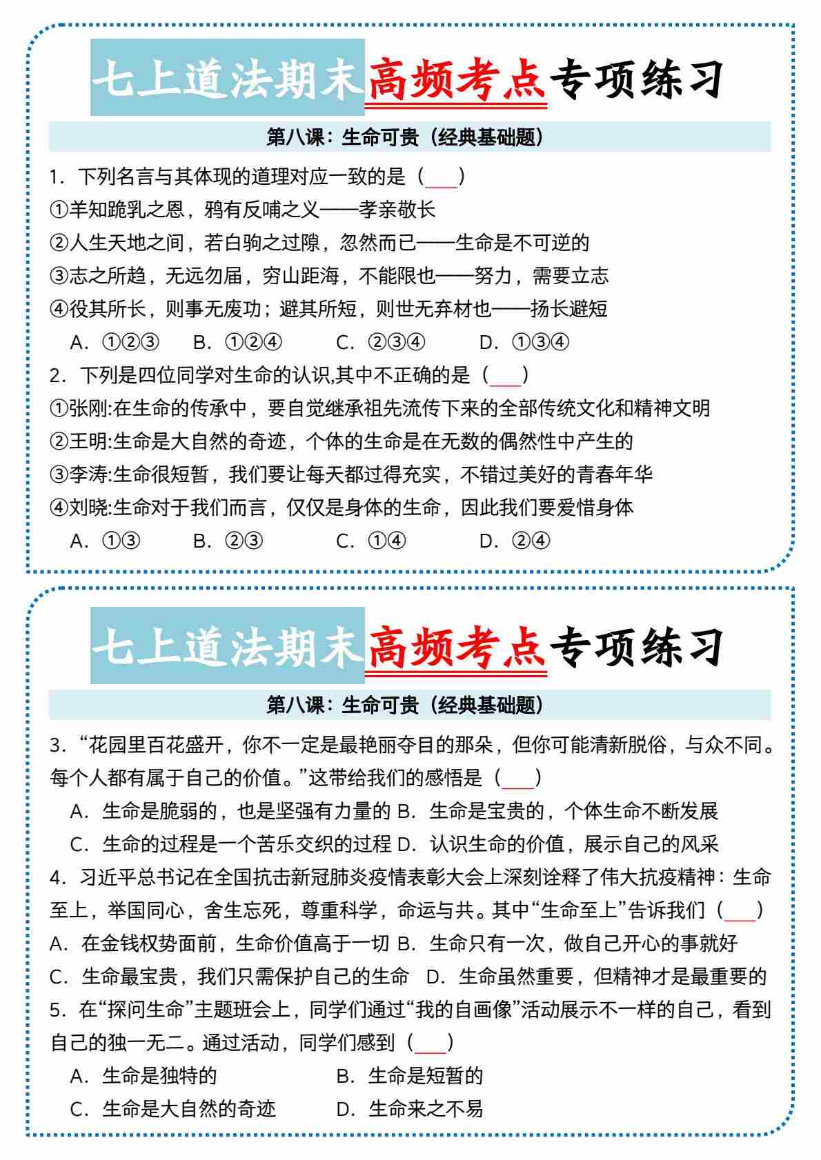 8七上道法第八课生命可贵高频考点小纸条