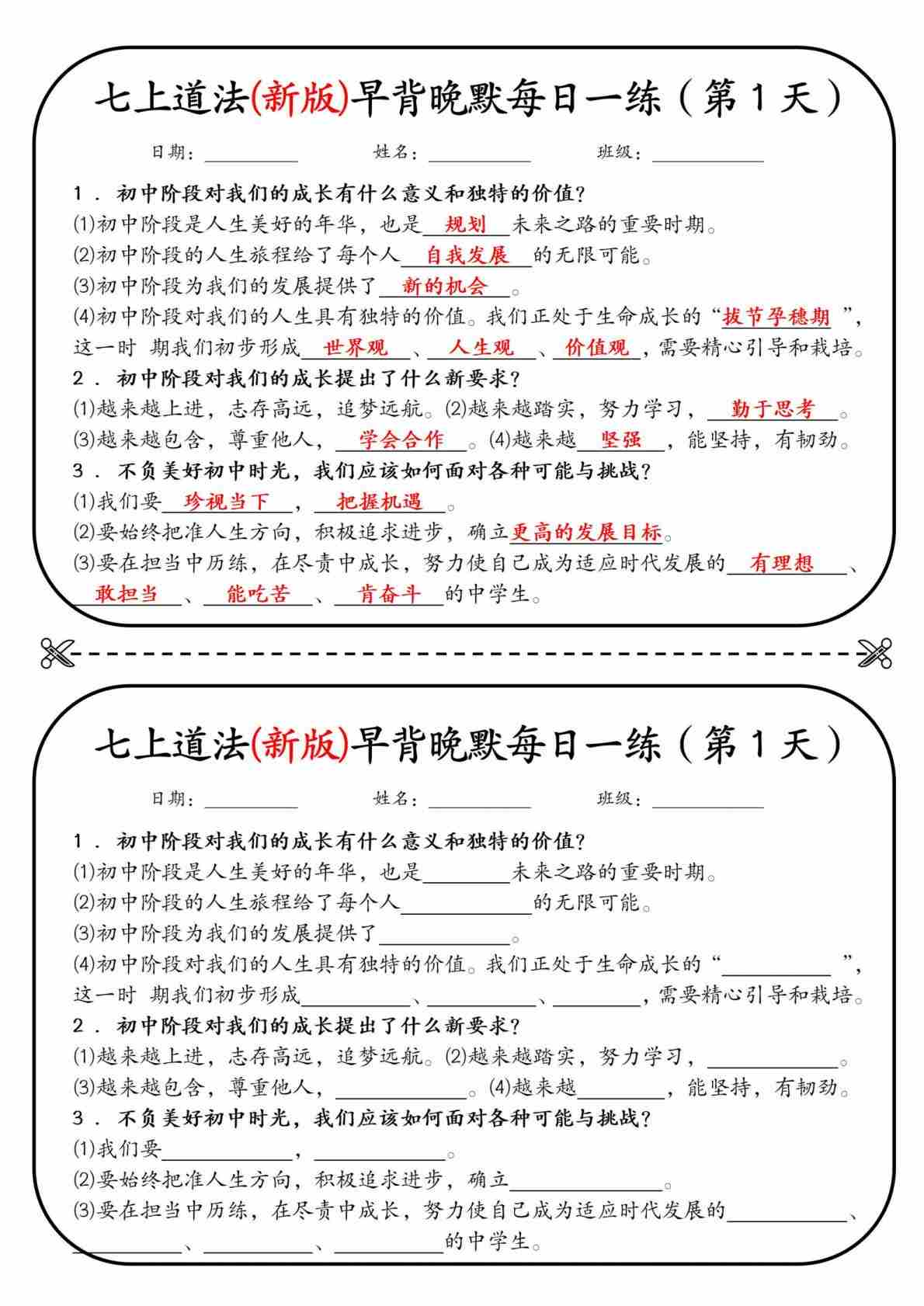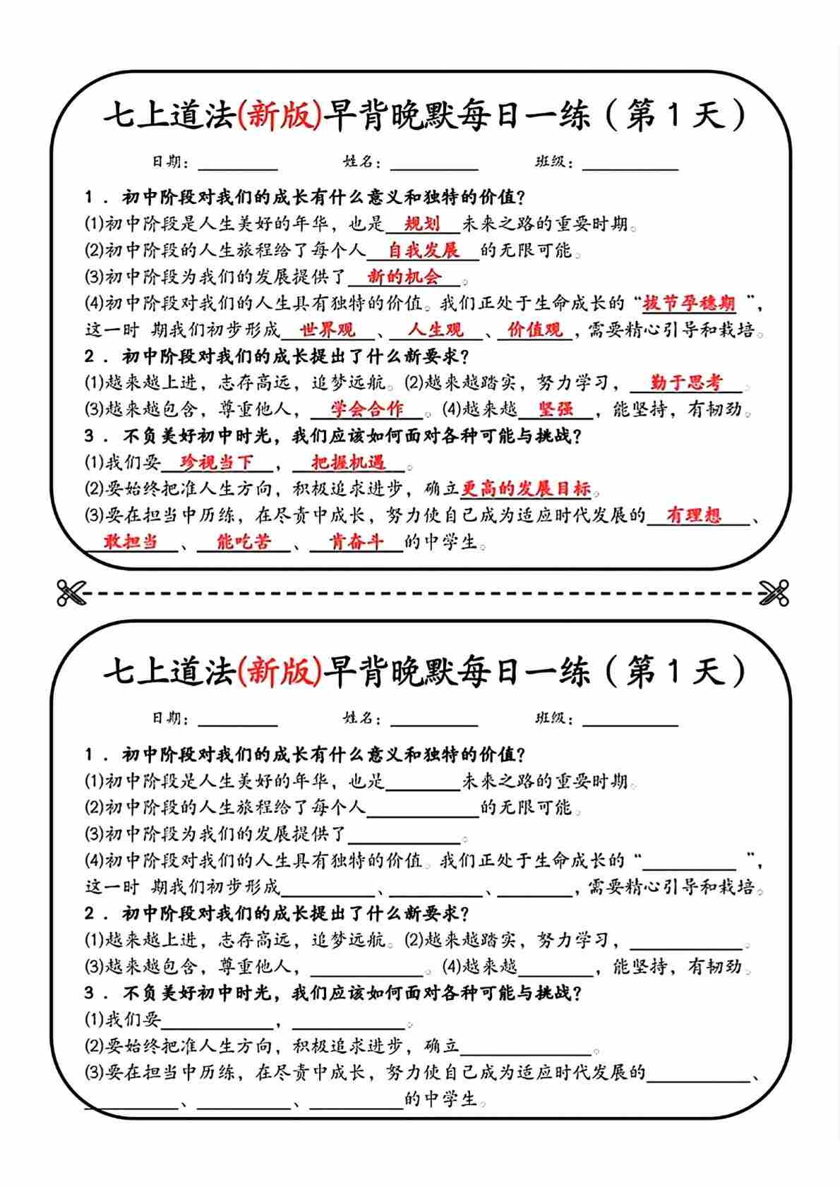 七上道法(新版)早背晚默每日一练(1)
