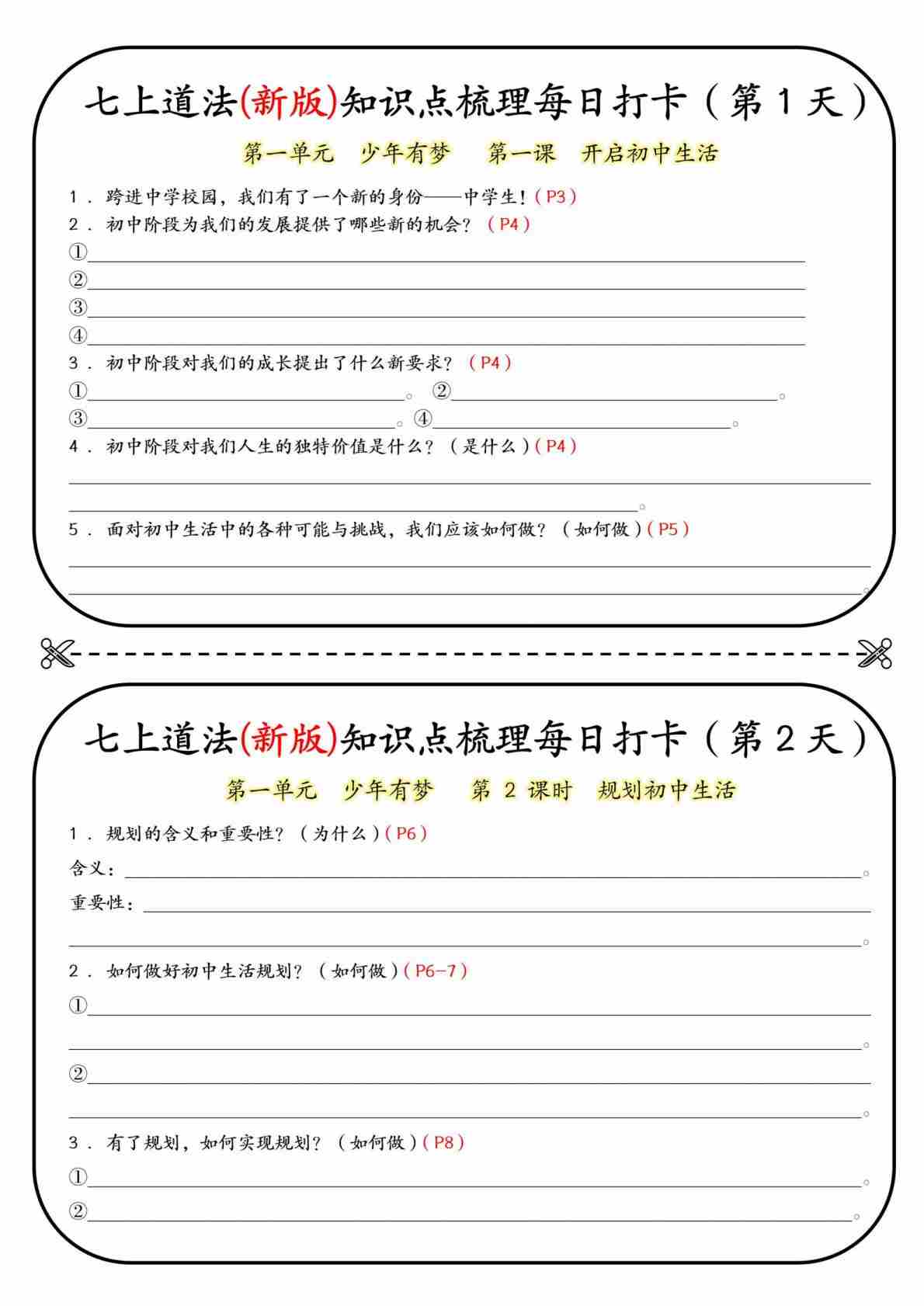 七上道法(新版)知识点梳理每日打卡【空白版】