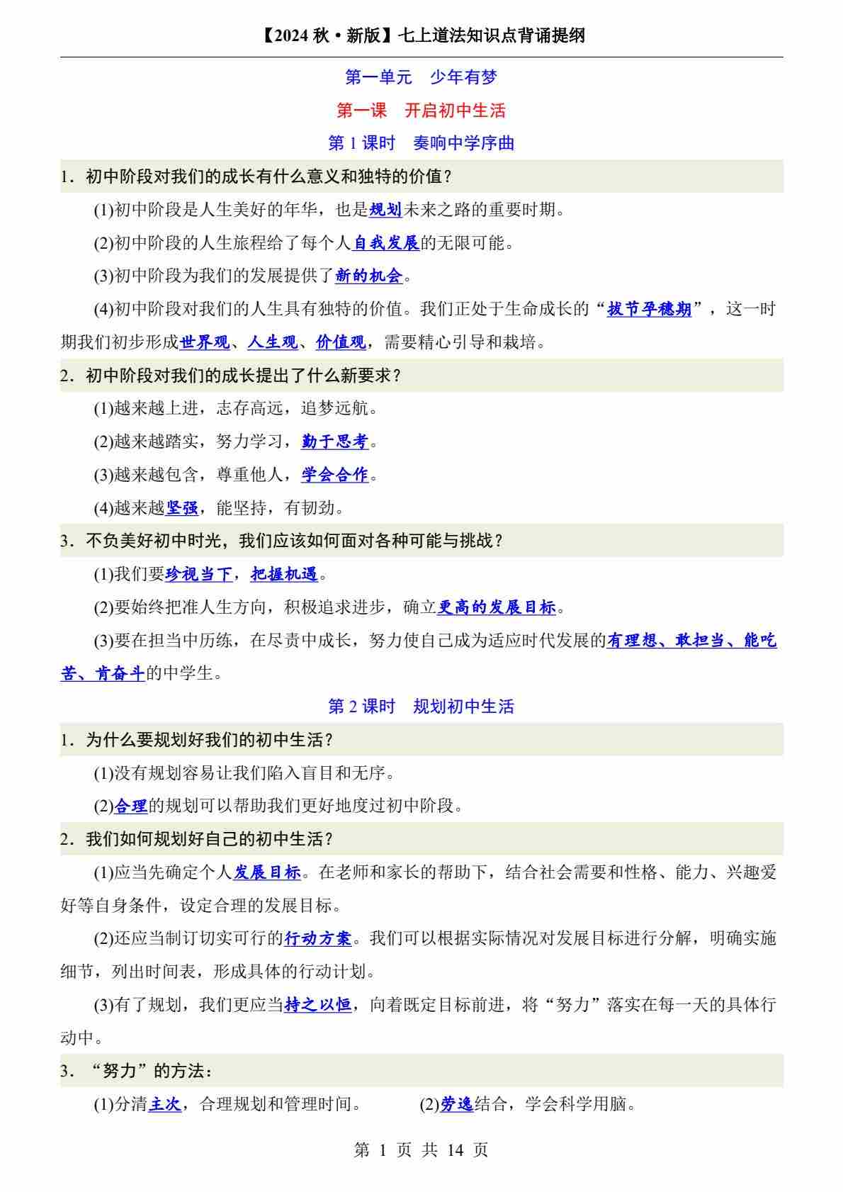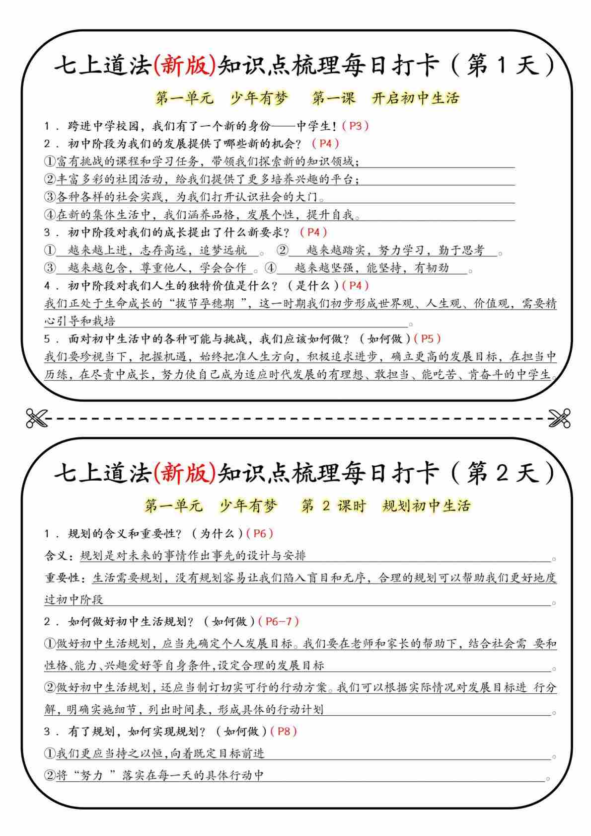 七上道法(新版)知识点梳理每日打卡【答案版】