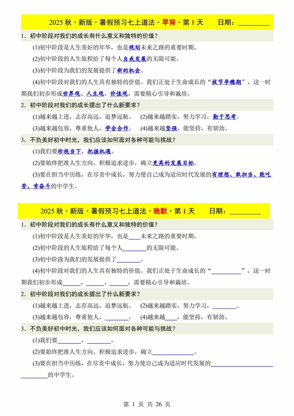 七上道法(新版)早背晚默每日一练