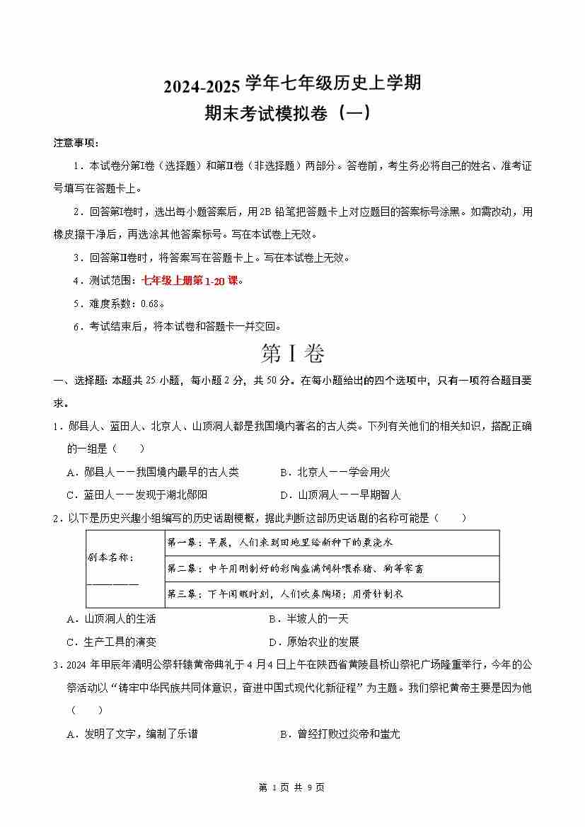 七年级上学期历史期末考试模拟卷01(原卷版)