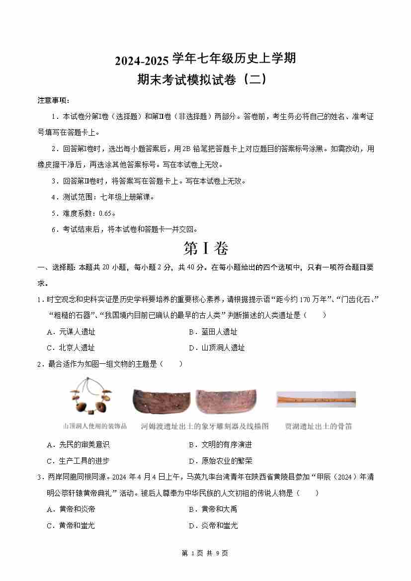 七年级上学期历史期末考试模拟卷02(原卷版)