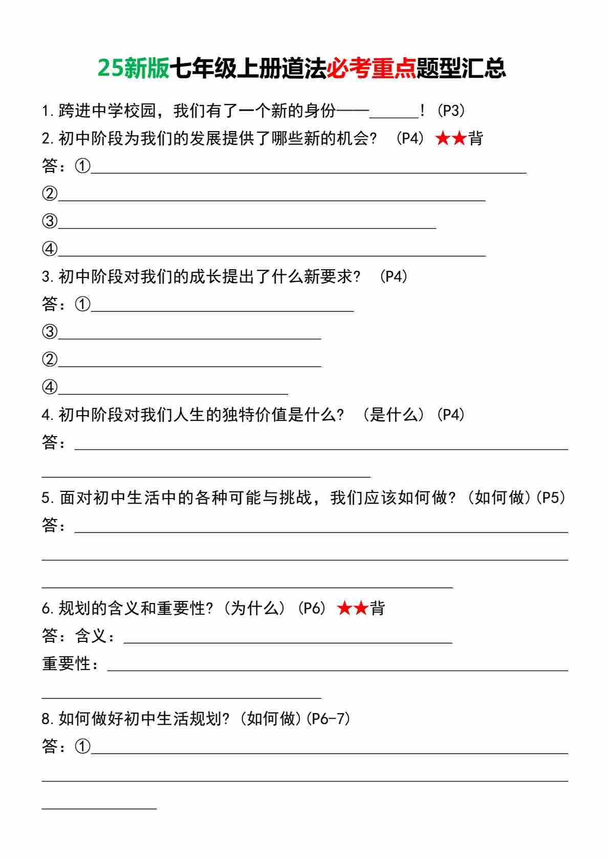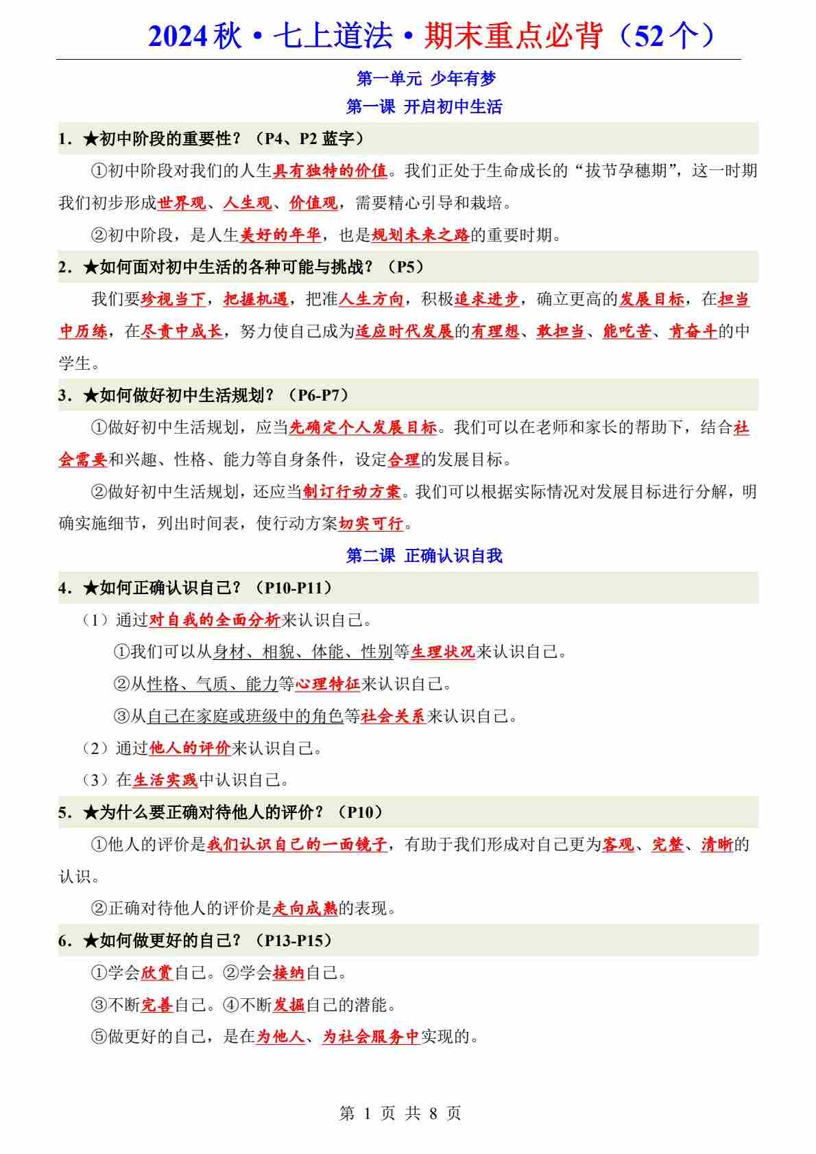 七上道法52个必背重点