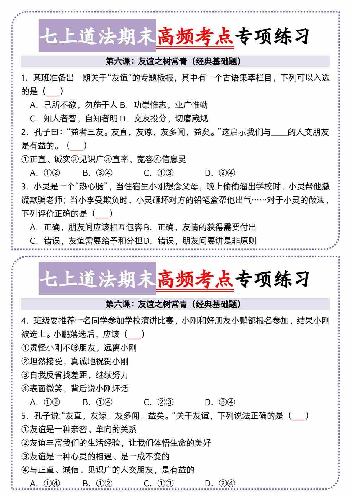 6七上道法第六课友谊之树常青高频考点小纸条