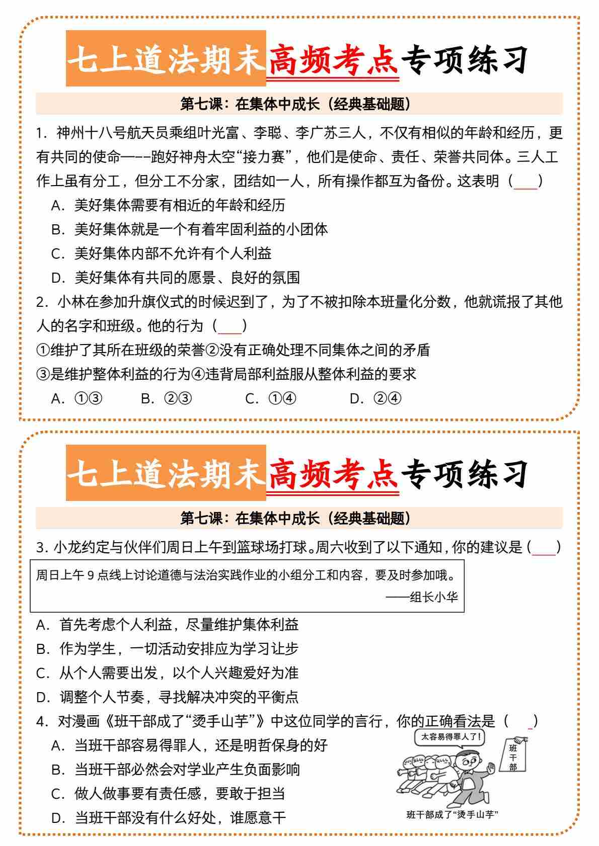 7七上道法第七课在集体中成长高频考点小纸条