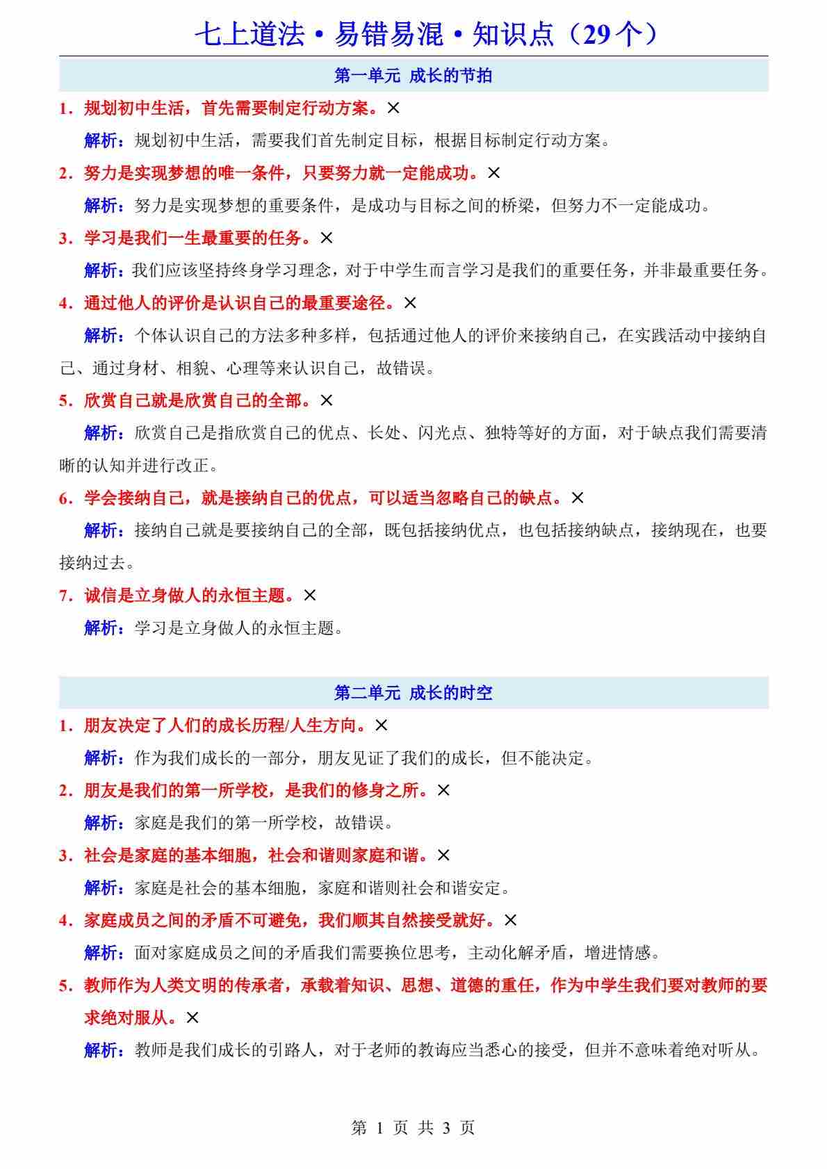 七上道法29个易错易混知识点