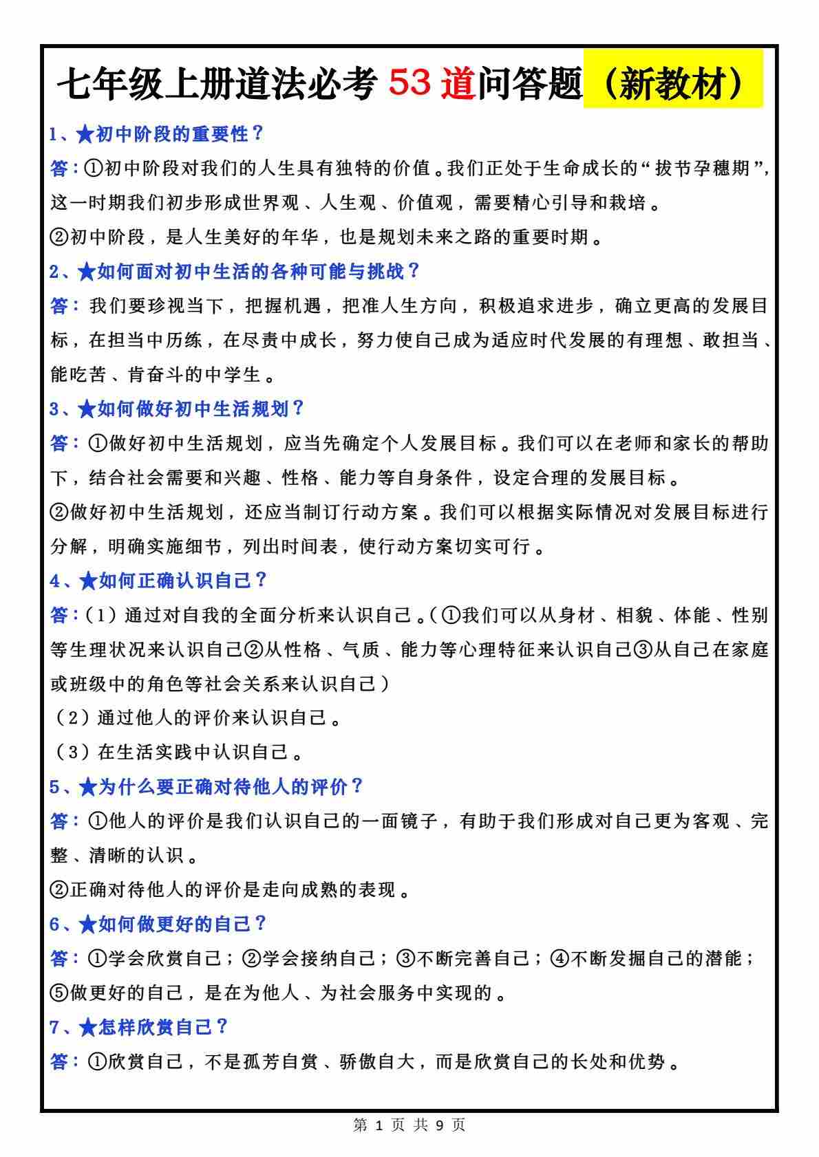 七上道法53道必考问答题