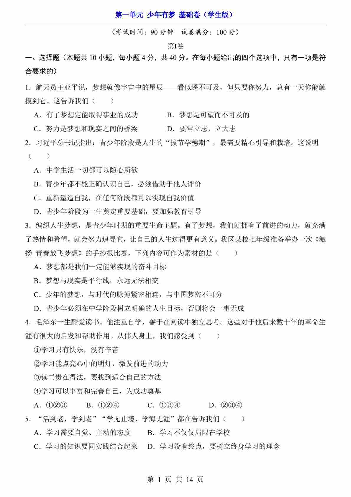 第1单元 少年有梦(基础卷)