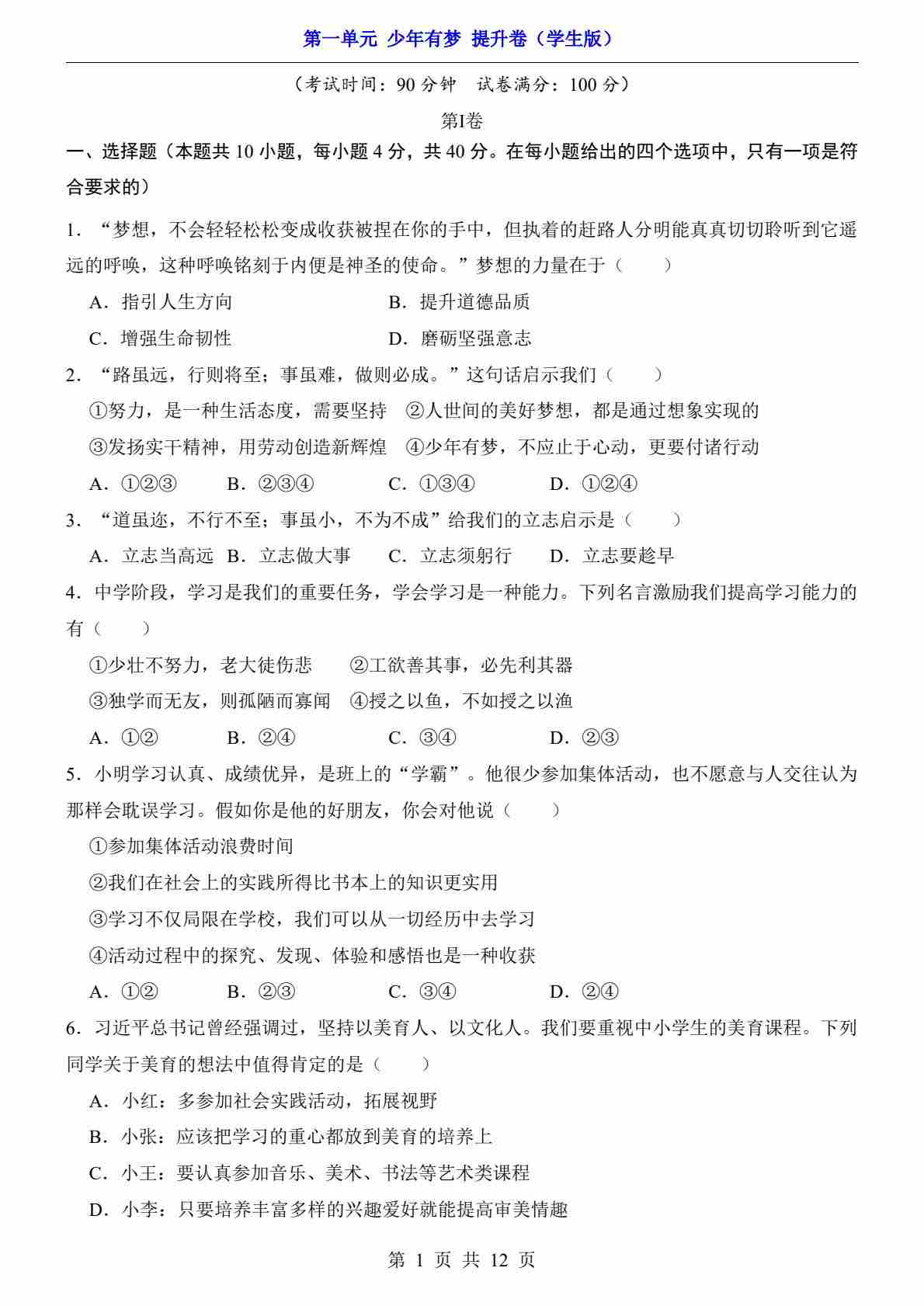 第1单元 少年有梦(提升卷)