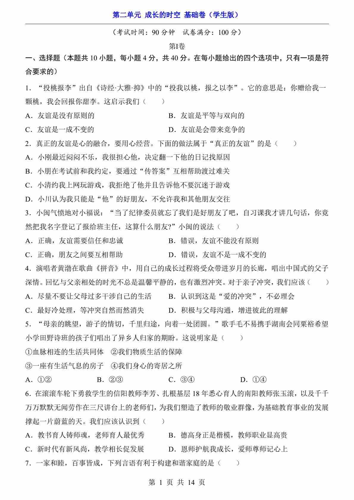 第2单元 成长的时空(基础卷)