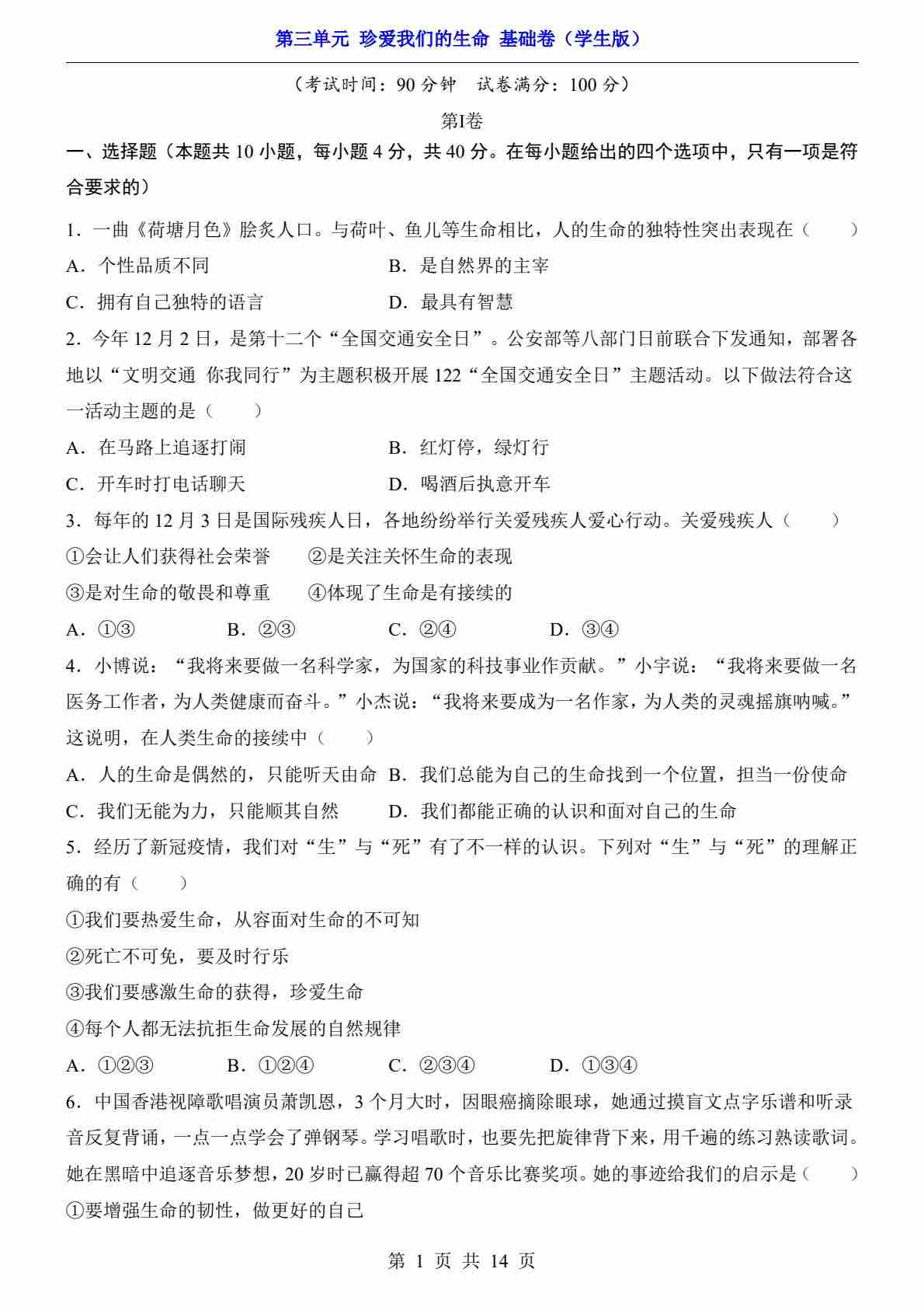 第3单元 珍爱我们的生命(基础卷)