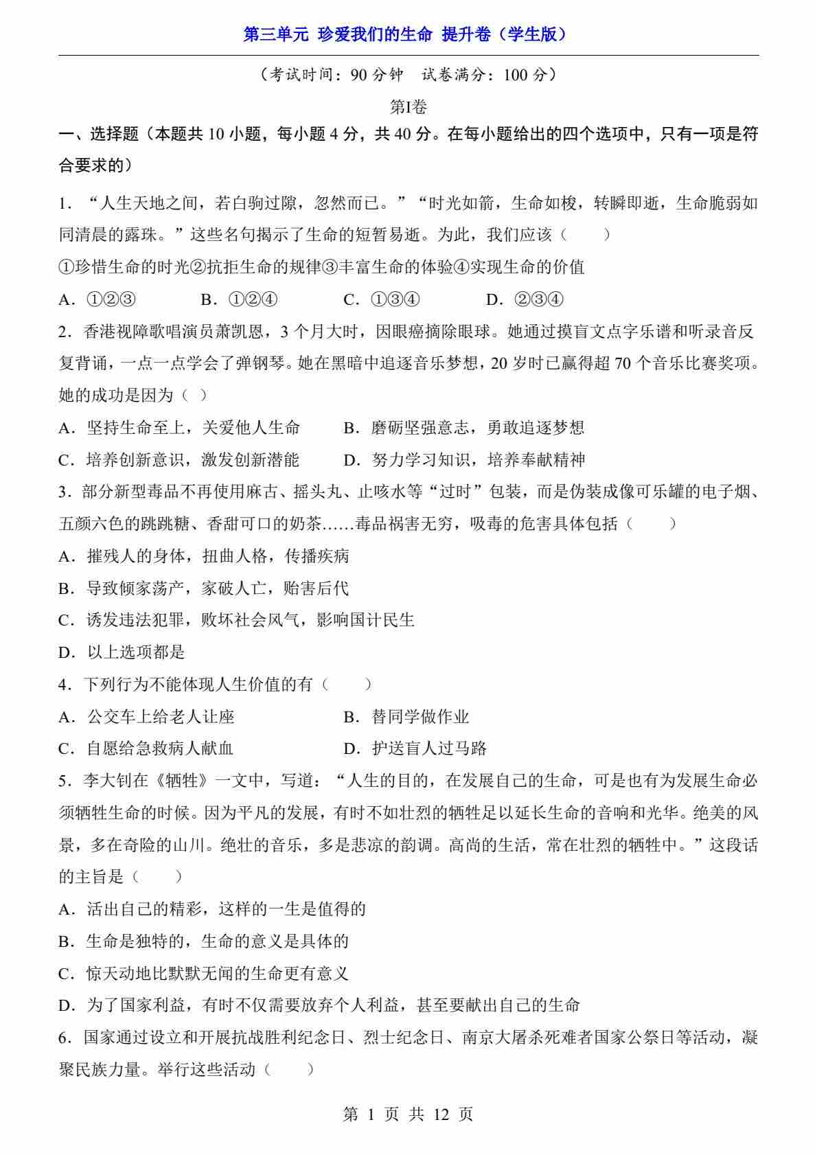 第3单元 珍爱我们的生命(提升卷)