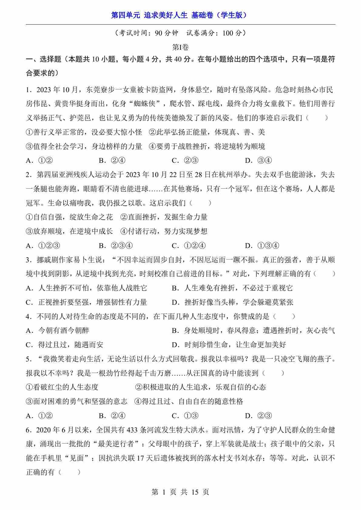 第4单元 追求美好人生(基础卷)