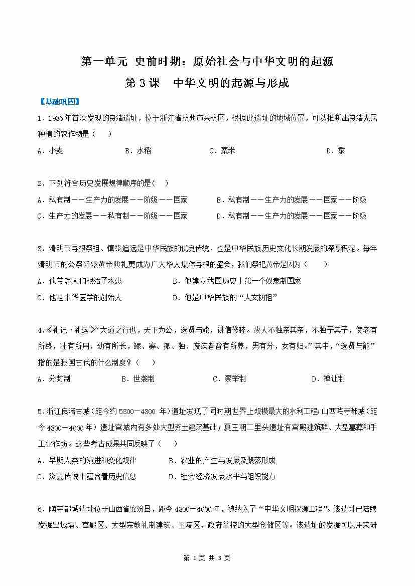 第3课 中华文明的起源与形成(分层作业)(原卷版)