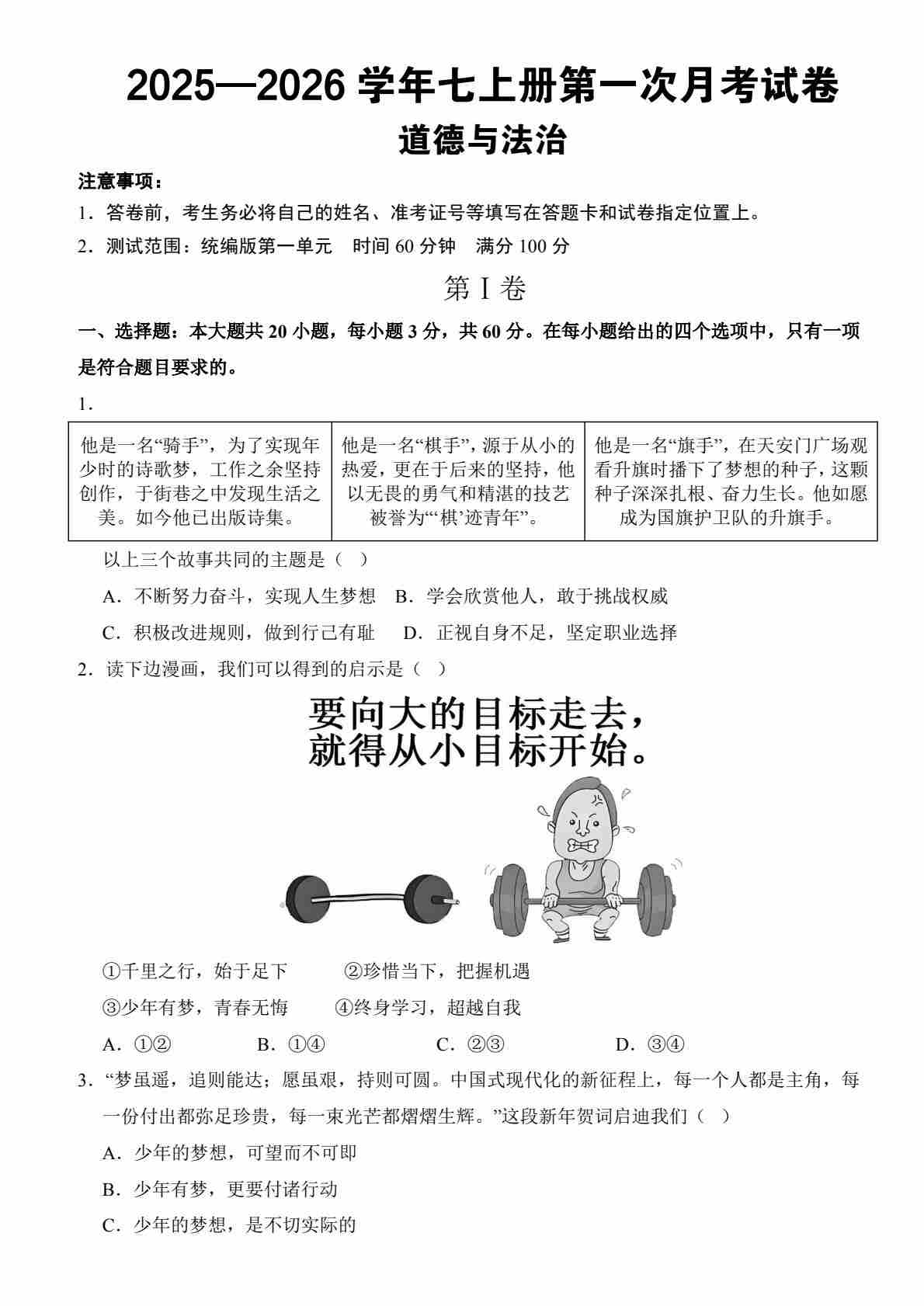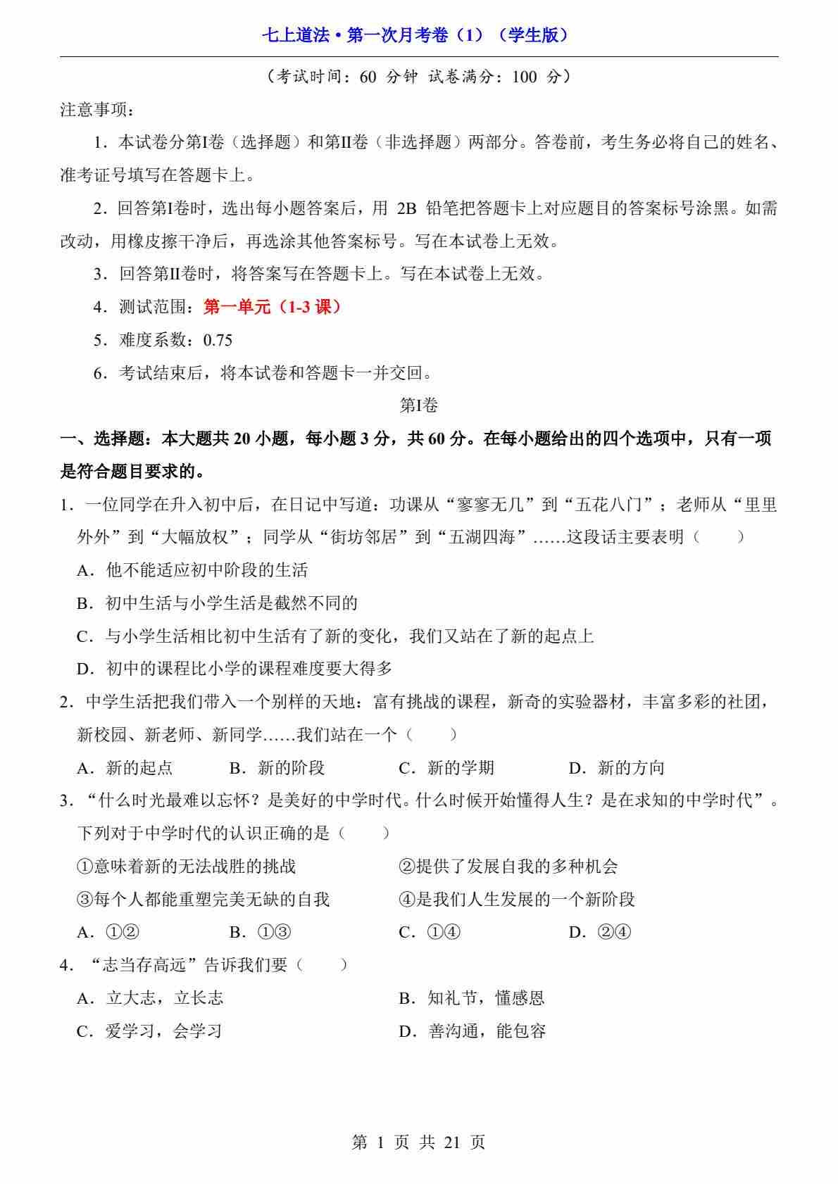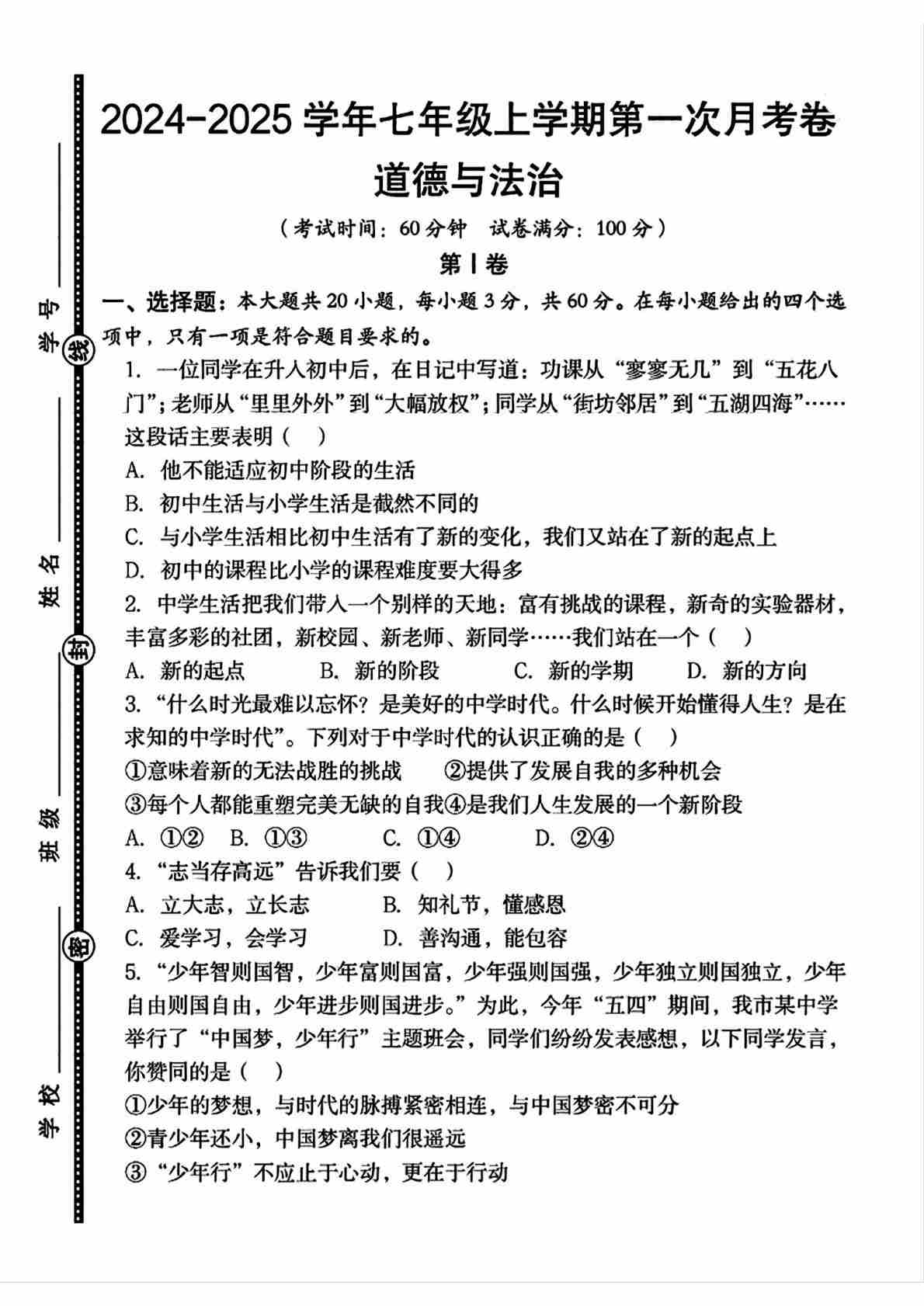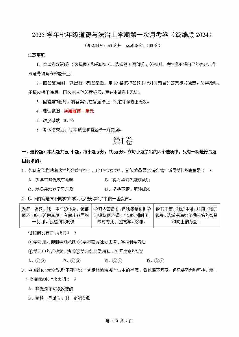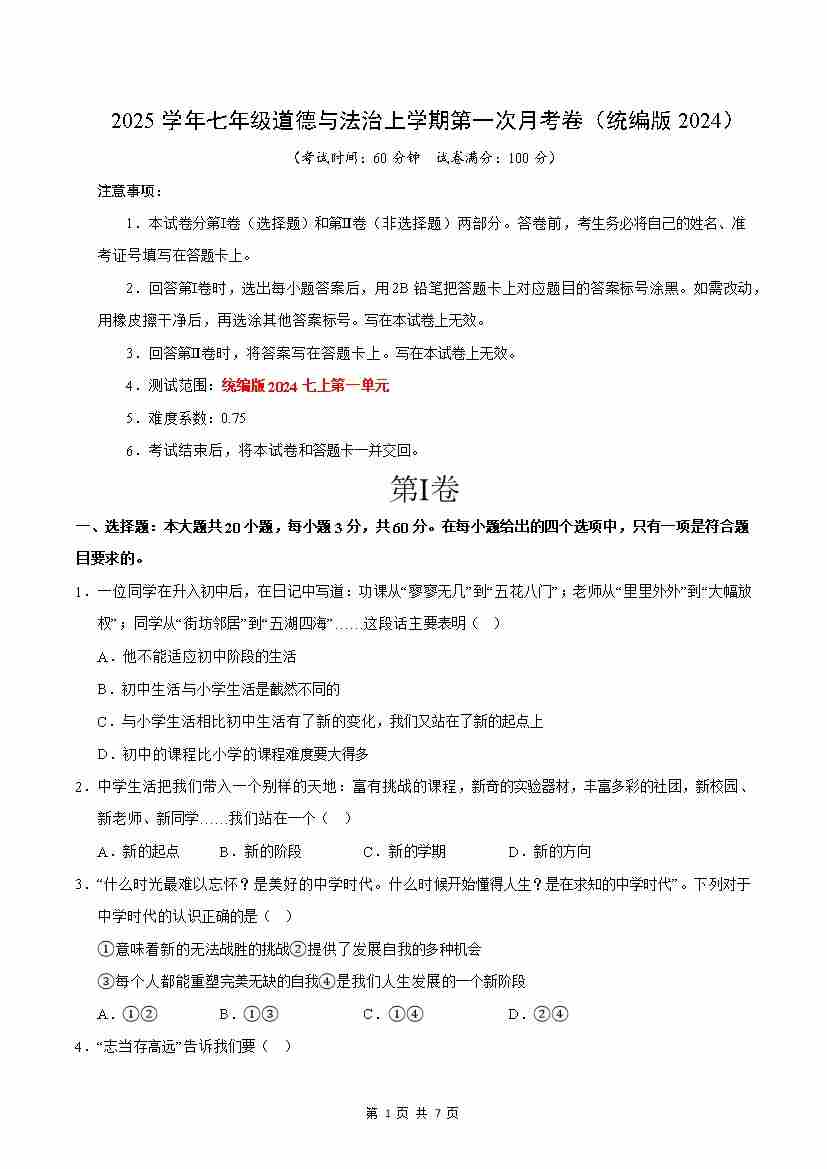 七年级道德与法治第一次月考卷01(考试版)A4版【测试范围:第一单元】(统编版2024)