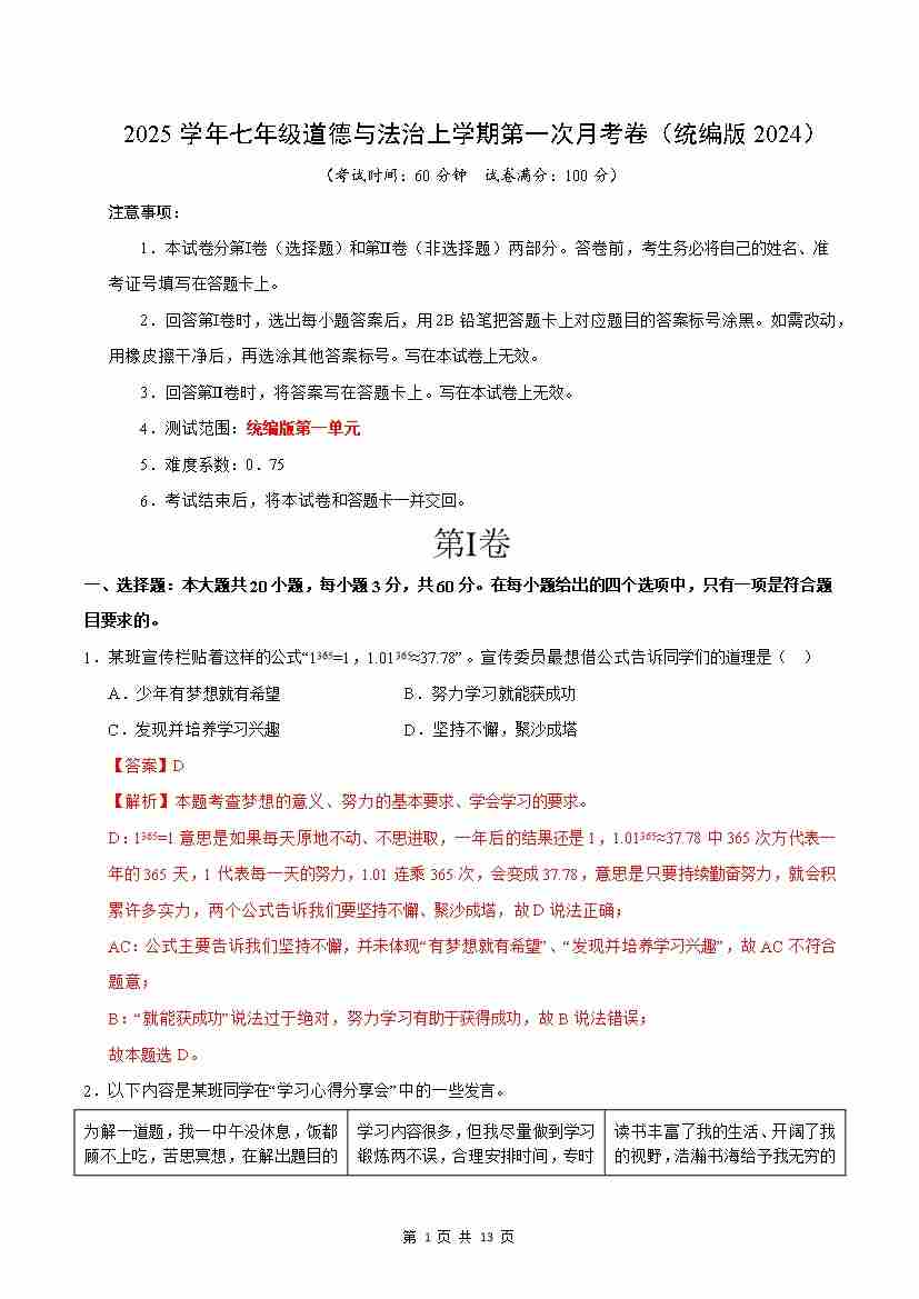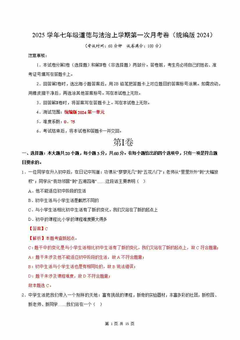 七年级道德与法治第一次月考卷01(全解全析)(统编版2024)