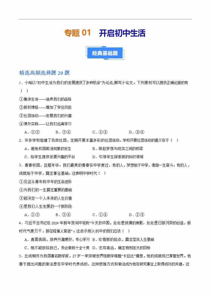 专题01 开启初中生活(高频选择题40题)(原卷版)