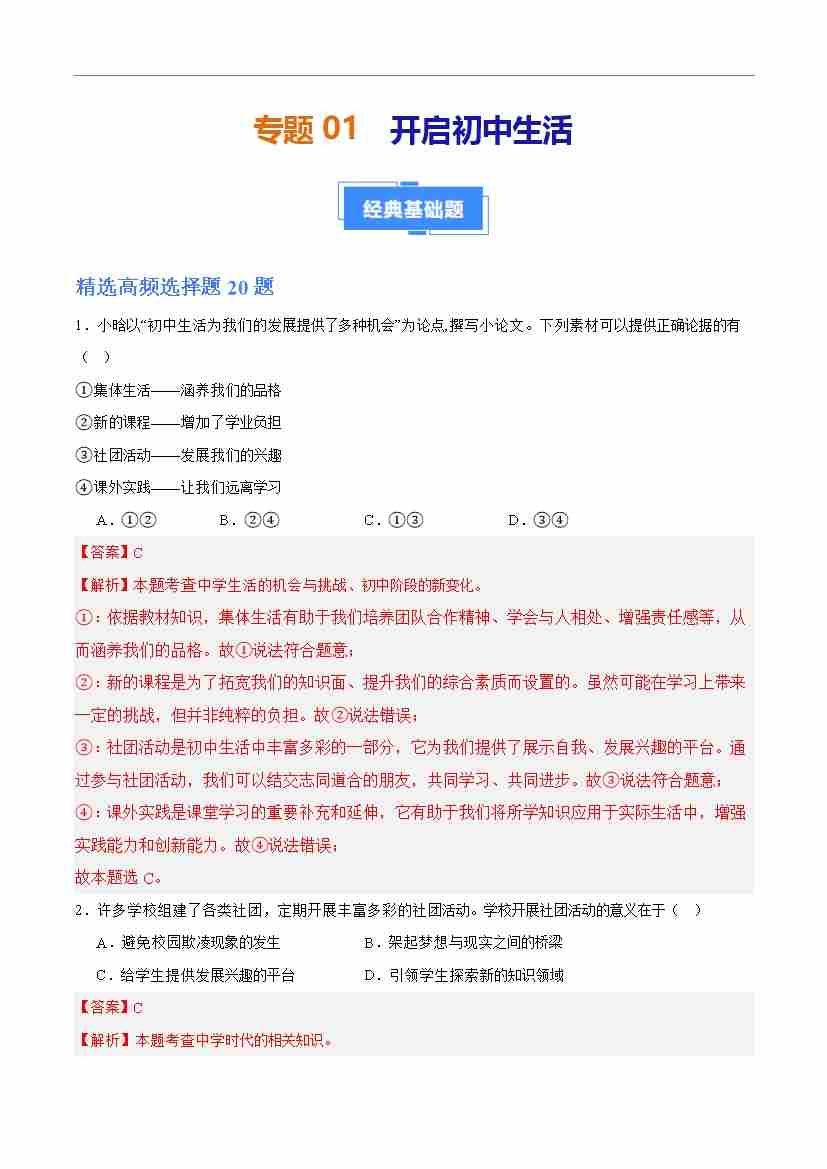 专题01 开启初中生活(高频选择题40题)(解析版)