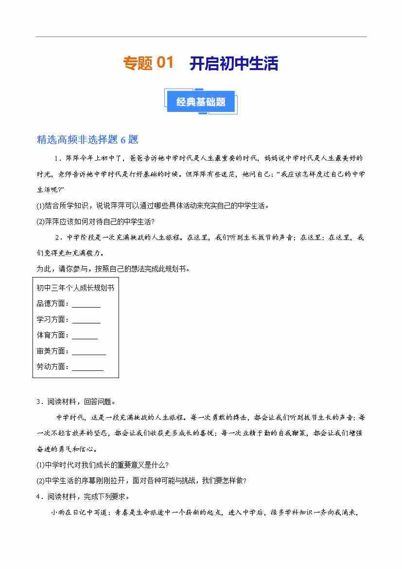 专题01 开启初中生活(高频非选题13题)(原卷版)