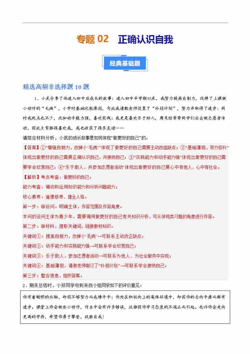 专题02 正确认识自我(高频非选择题20题)(解析版)