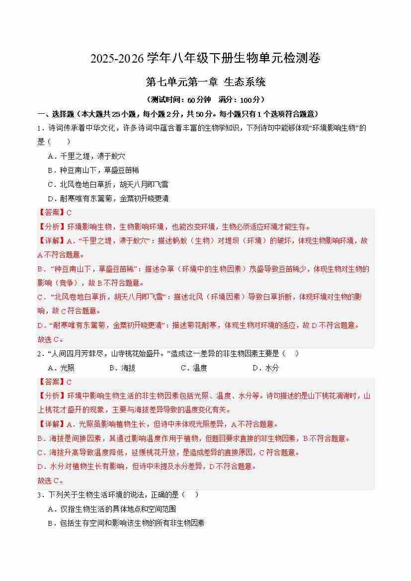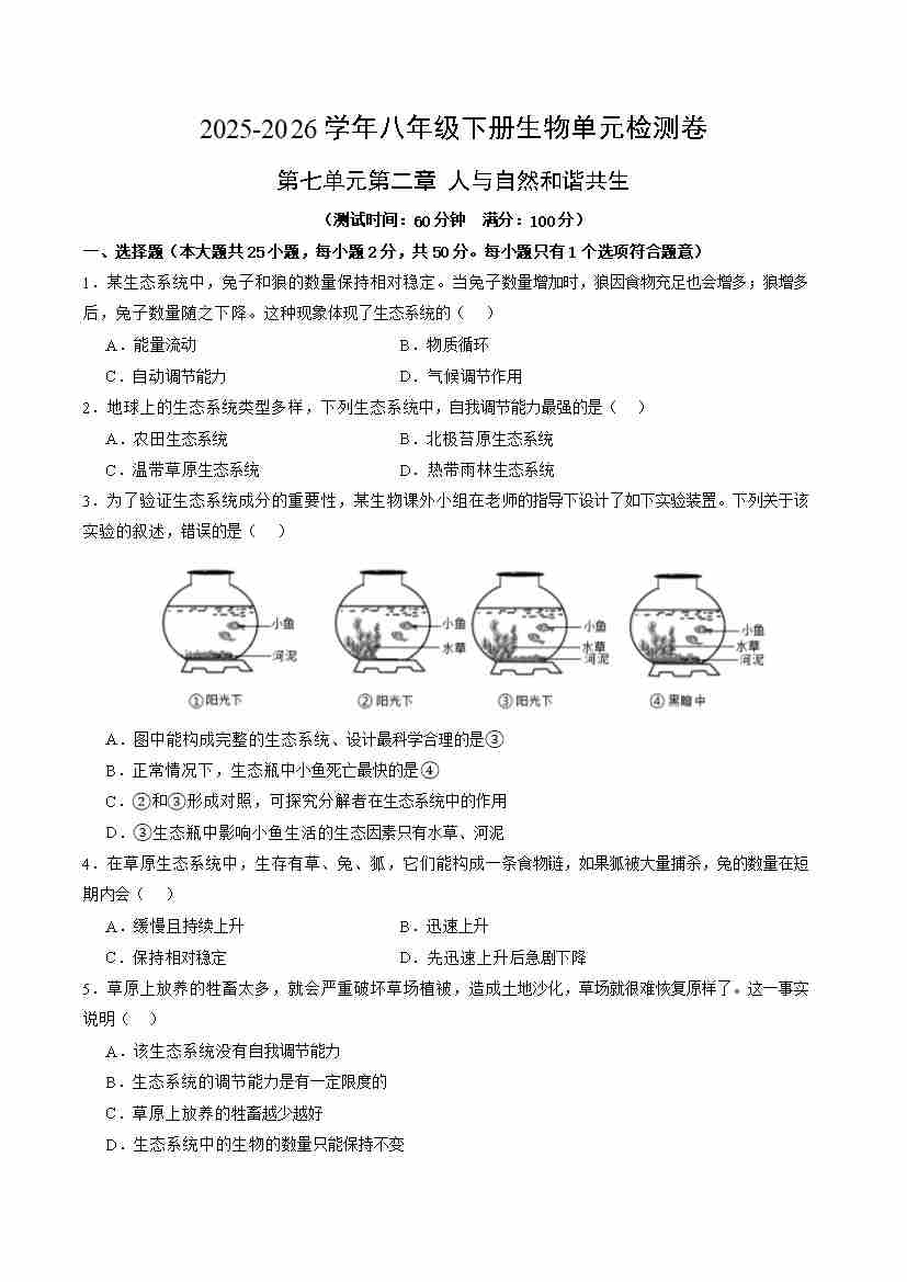 第七单元第二章 人与自然和谐共生(单元测试)(考试版A4)