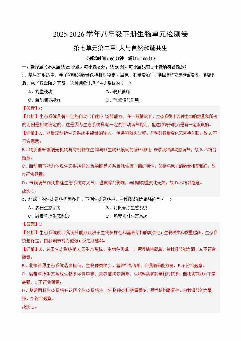 第七单元第二章 人与自然和谐共生(单元测试)(解析版)