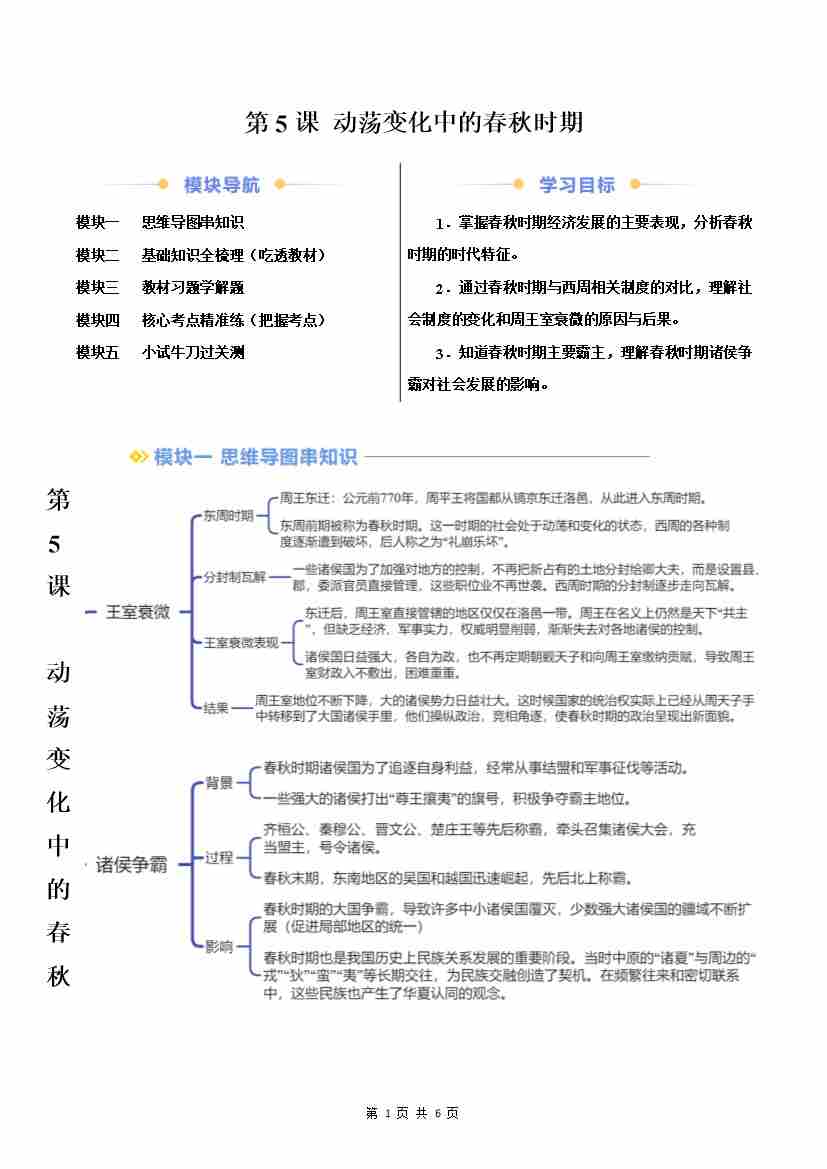 第5课 动荡变化中的春秋时期(原卷版)