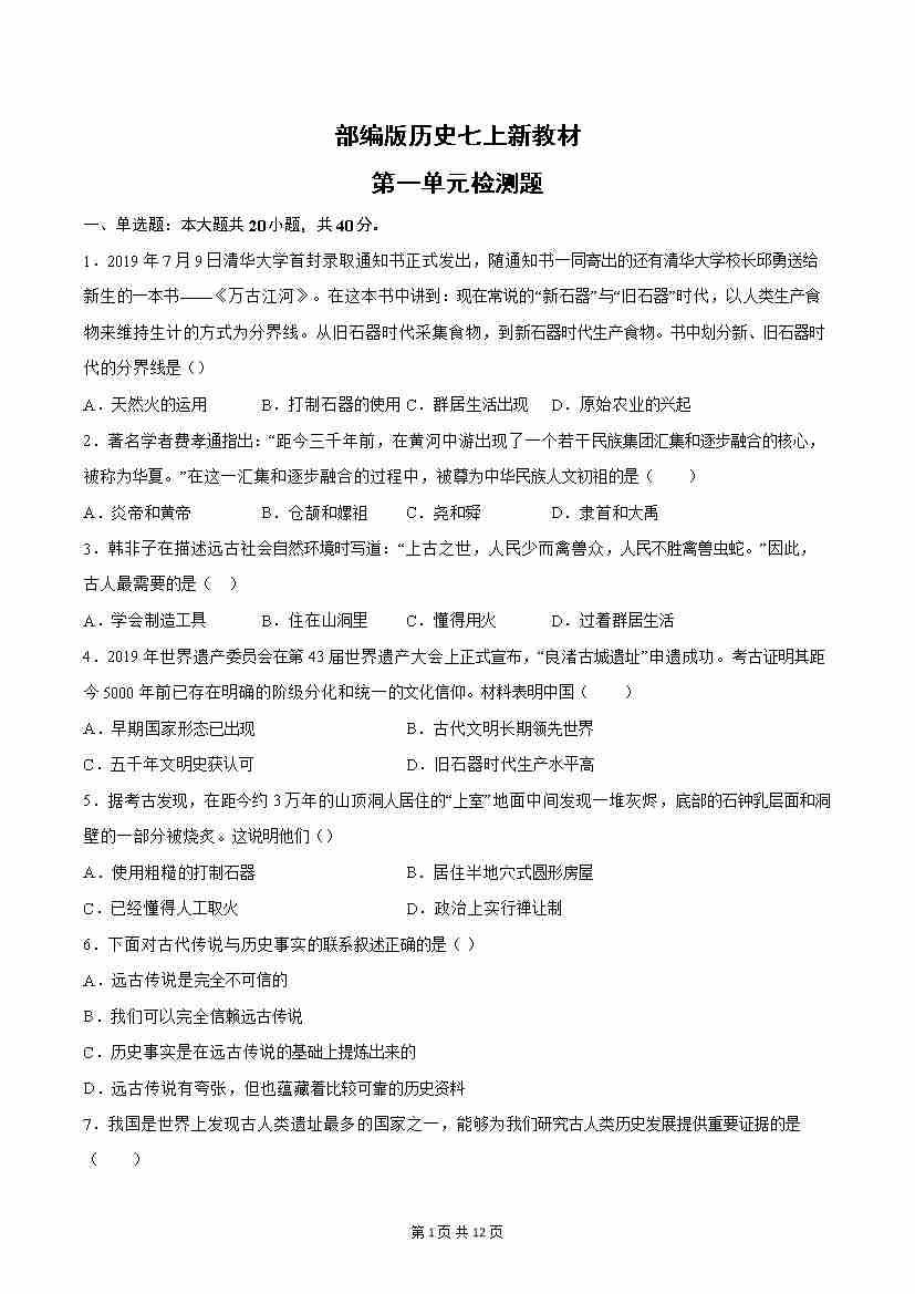 第一单元检测题(后附答案解析)-【暑假自学课】2024年新七年级历史暑假提升精品讲义(统编版2024)