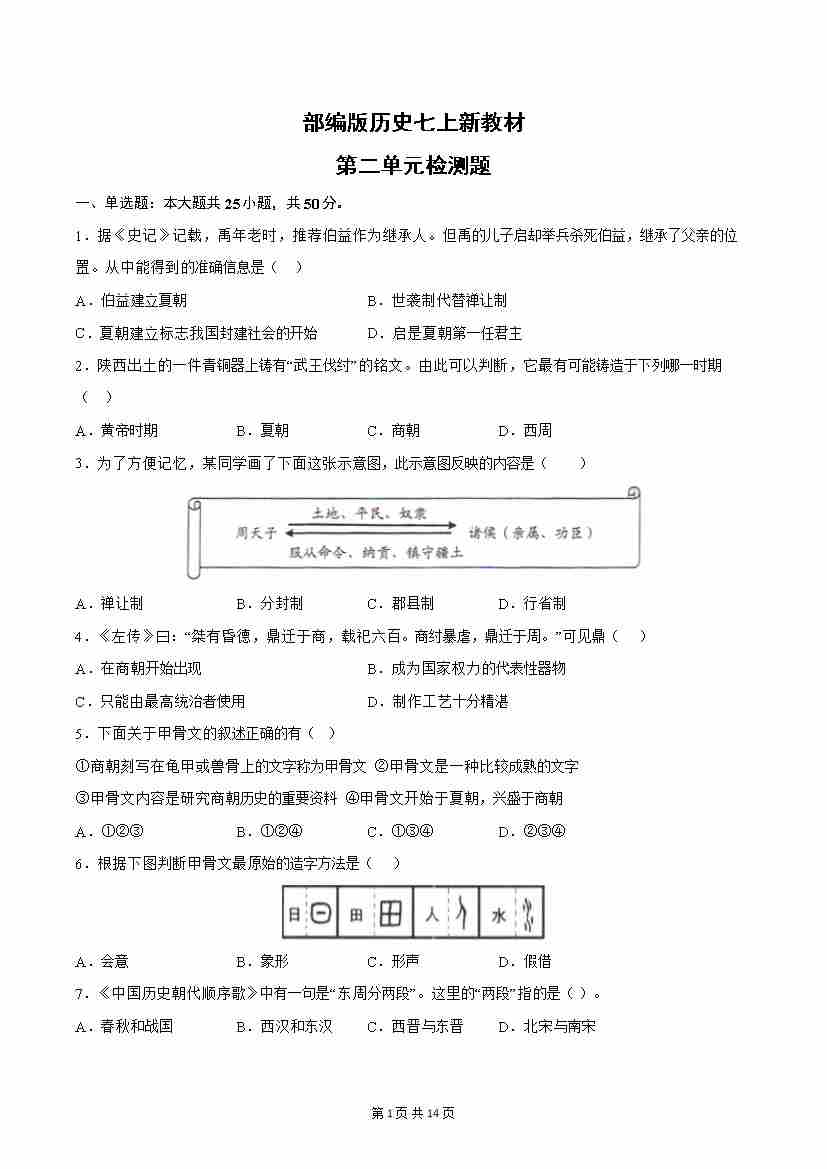 第二单元检测题(后附答案解析)-【暑假自学课】2024年新七年级历史暑假提升精品讲义(统编版2024)