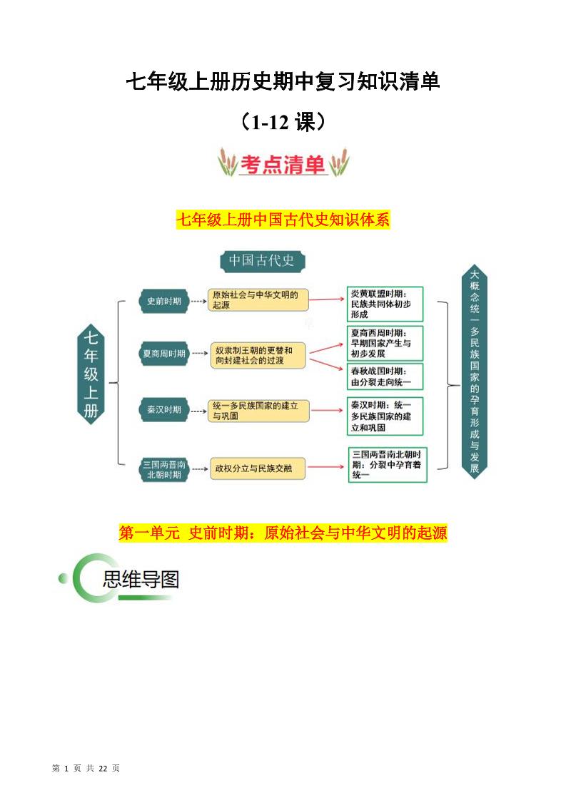 第一单元 史前时期:原始社会与中华文明的起源【速记清单】-2024-2025学年七年级历史上册单元速记·巧练(统编版2024)