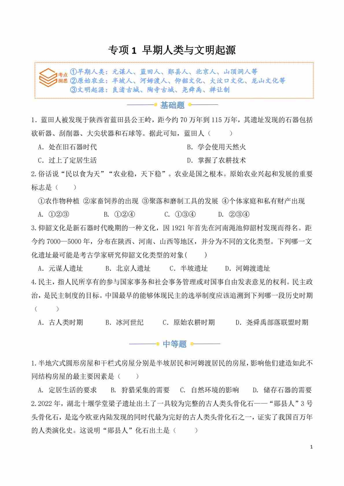专项1 早期人类与文明起源(原卷版)