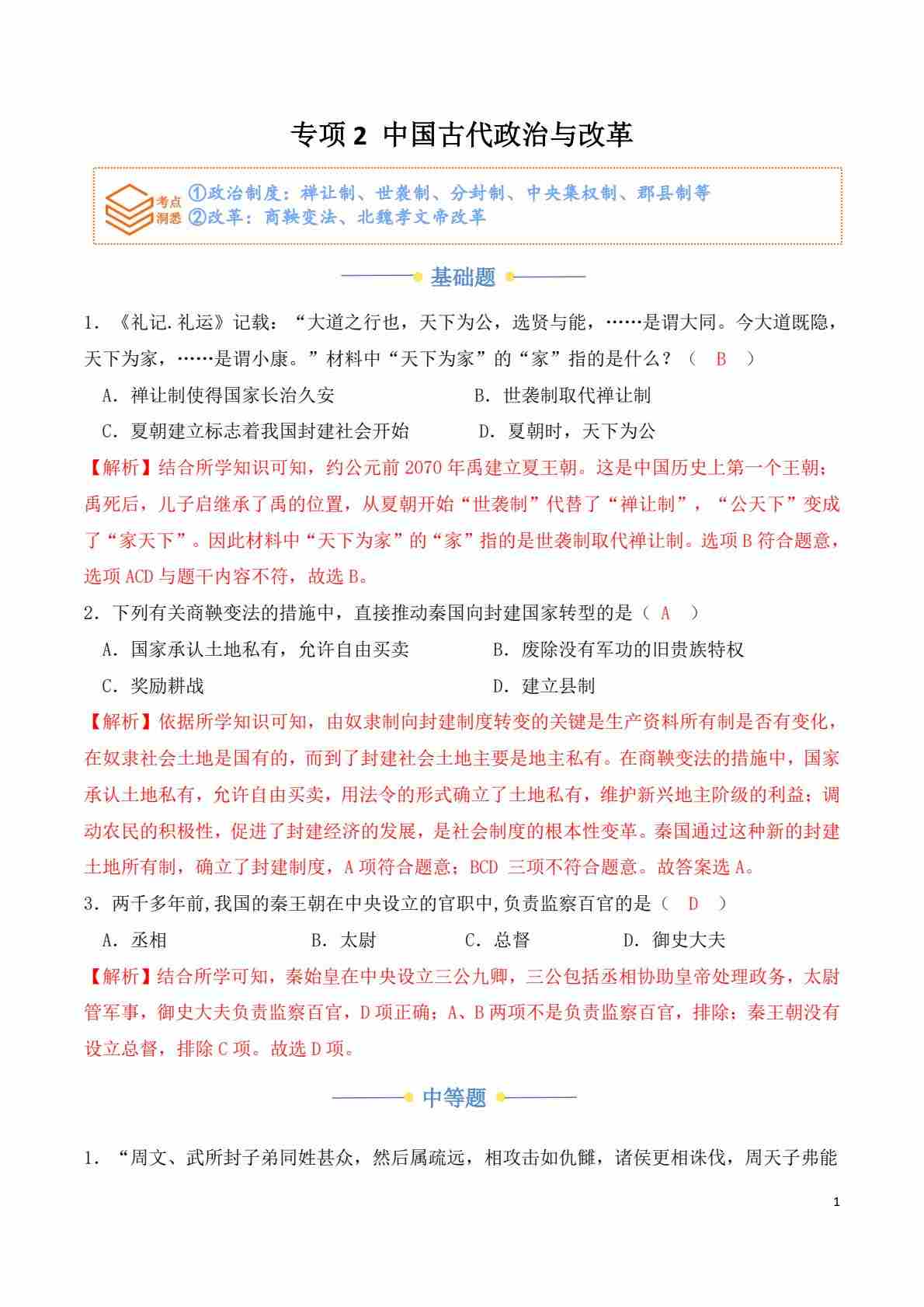 专项2 中国古代政治与改革(解析版)