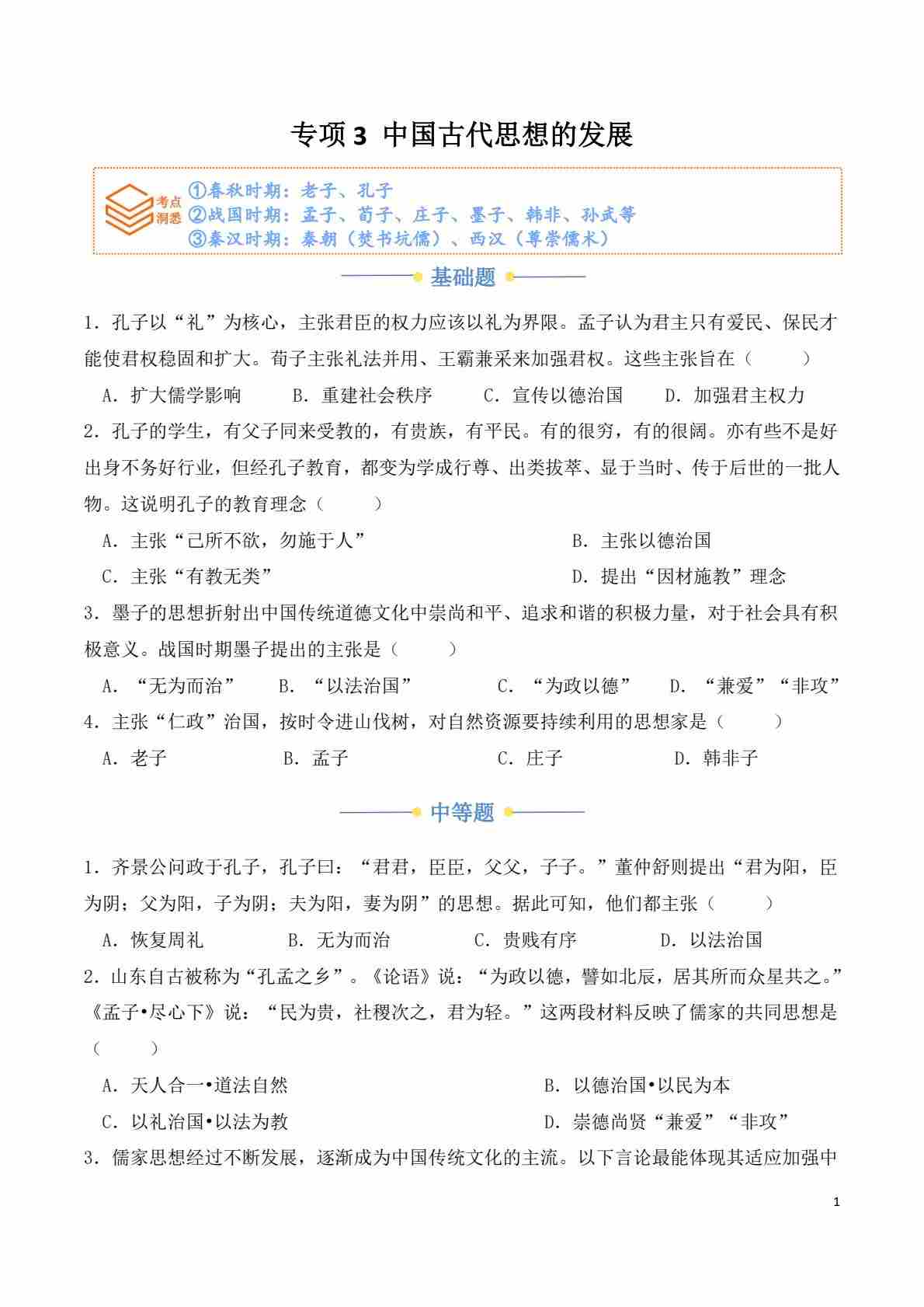 专项3 中国古代思想的发展(原卷版)