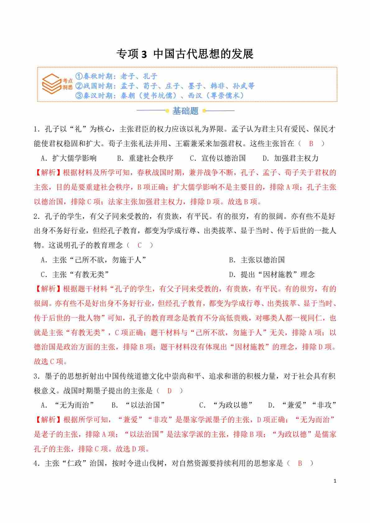 专项3 中国古代思想的发展(解析版)