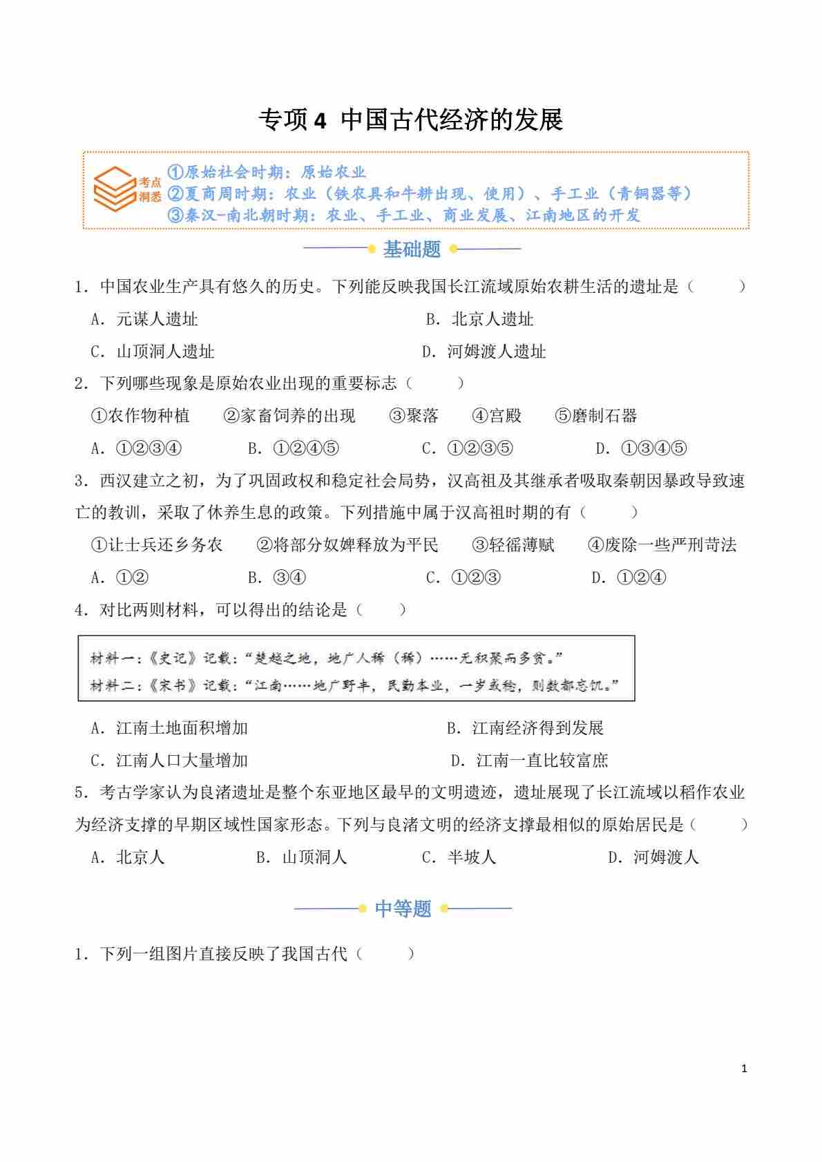 专项4 中国古代经济的发展(原卷版)