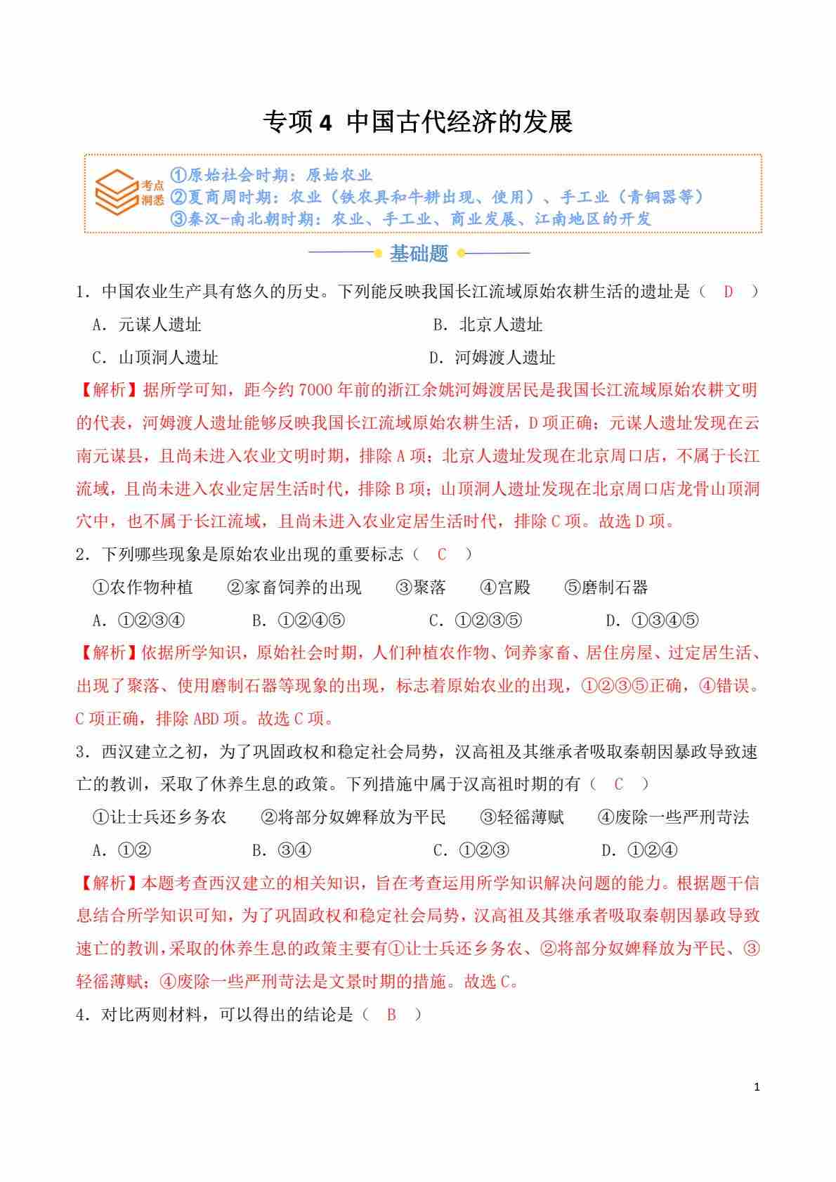专项4 中国古代经济的发展(解析版)