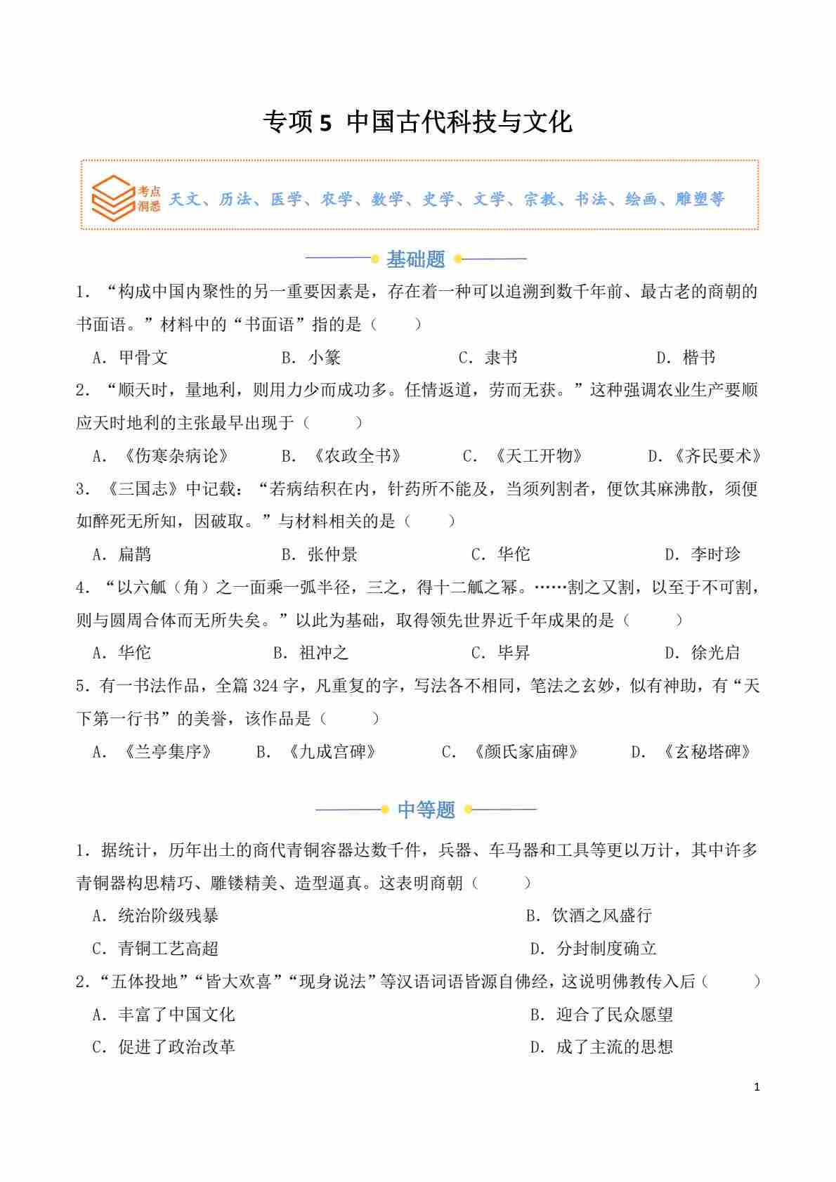 专项5 中国古代科技与文化(原卷版)