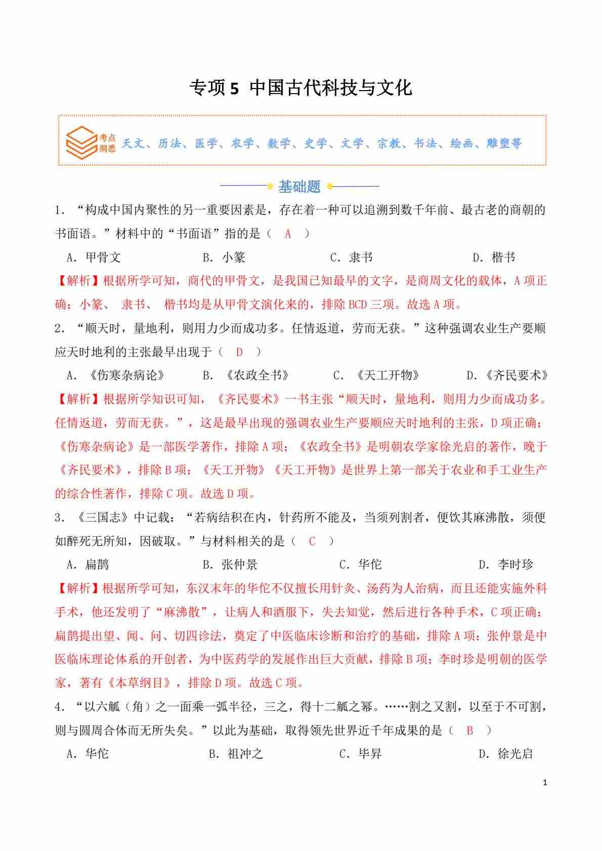 专项5 中国古代科技与文化(解析版)