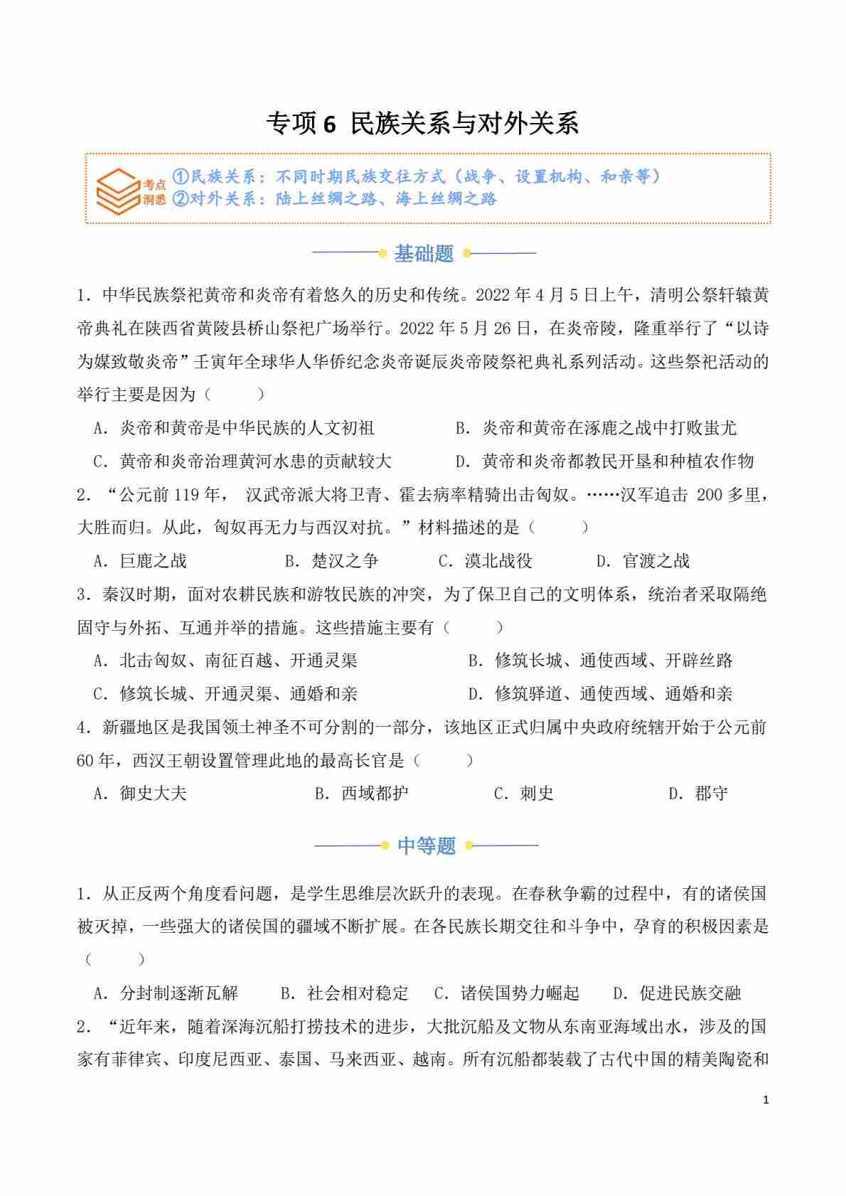 专项6 民族关系与对外关系(原卷版)