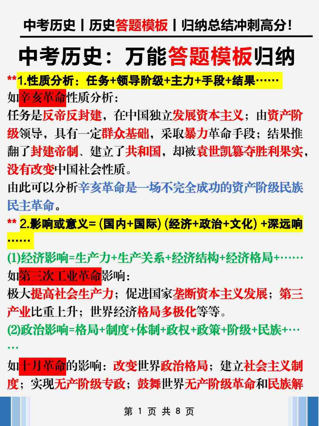 中考历史:万能答题模板归纳总结