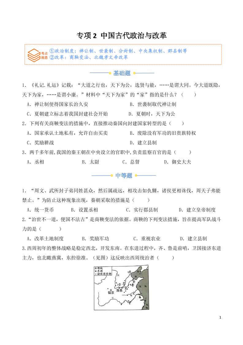 专项2 中国古代政治与改革(原卷版)..